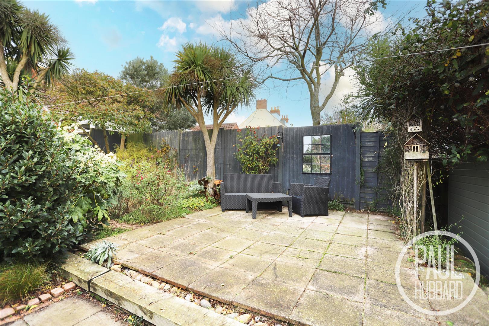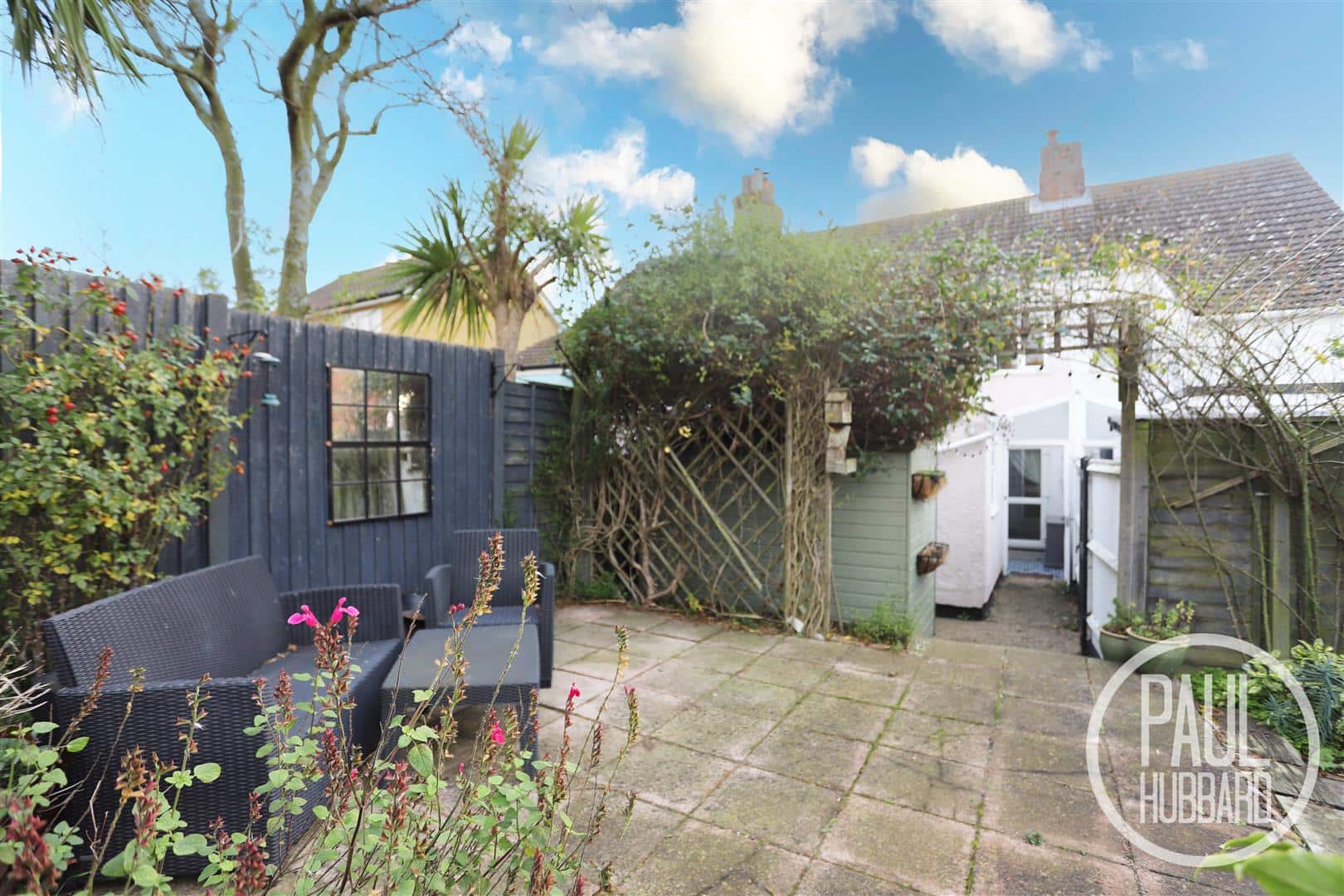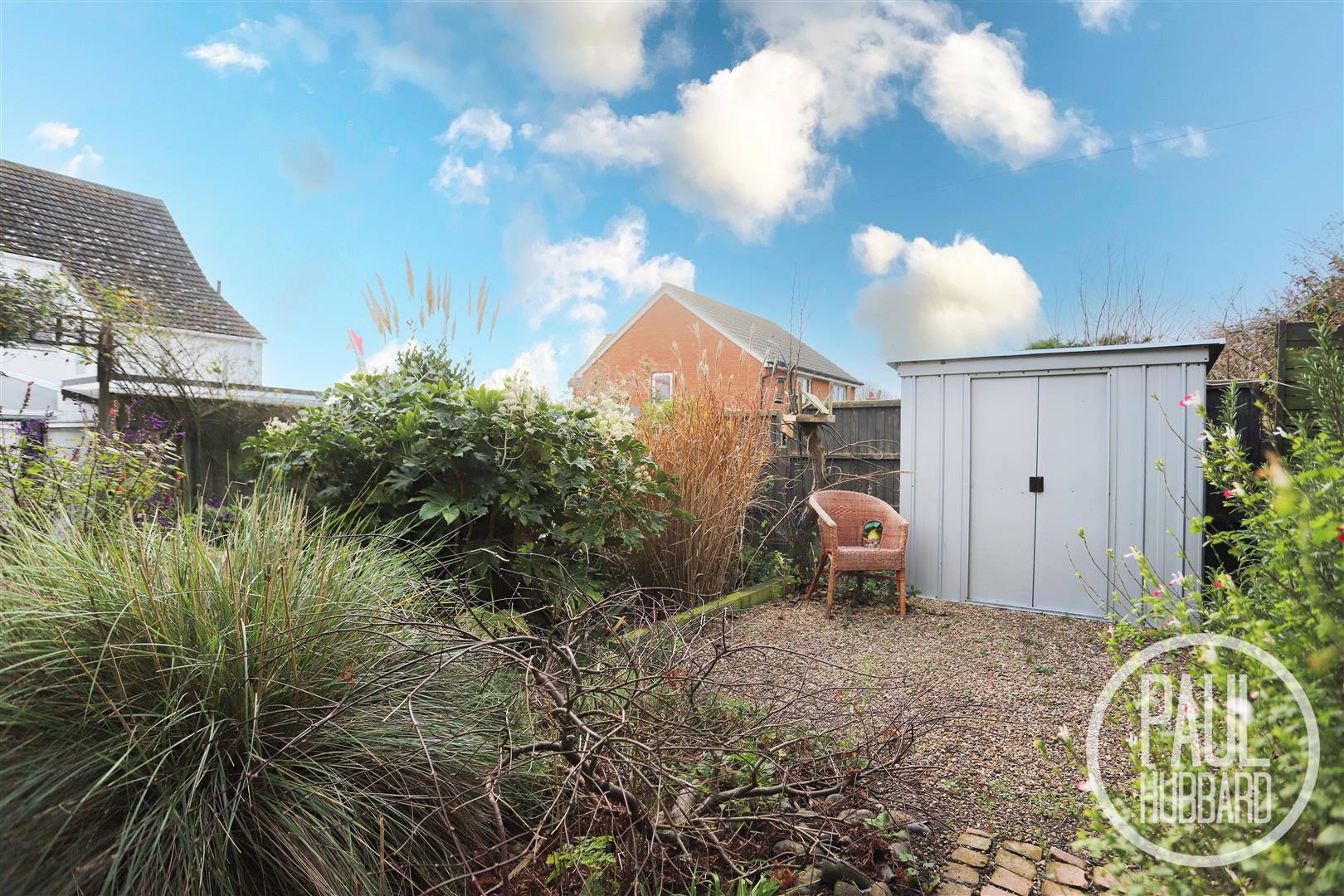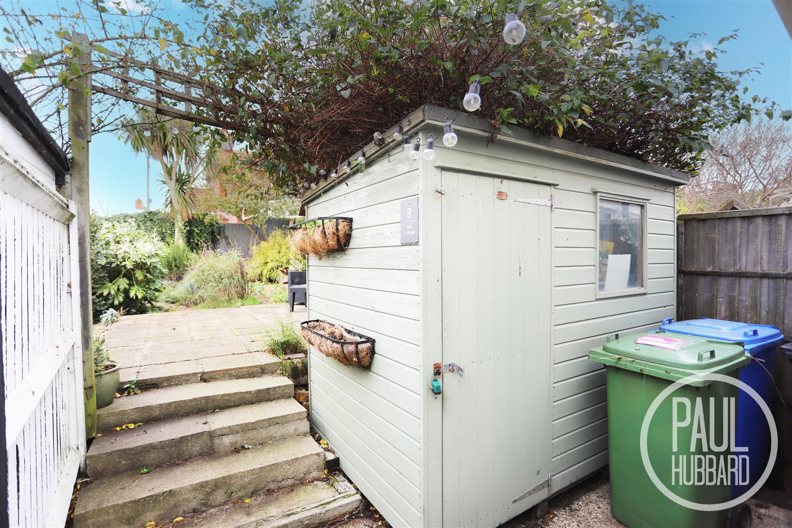 The outside space includes a designated bin storage area, timber shed, and a gated right of way for practical access. Steps rise beneath a plant-covered archway, leading to attractive tiered patio areas. The garden is mature and well-established, surrounded by an array of plants, shrubs and trees, with a shingle seating area and an additional enclosed storage unit, all fully bordered by panel fencing. The open south-westerly aspect creates a wonderful sun-trap, ideal for outdoor enjoyment.
