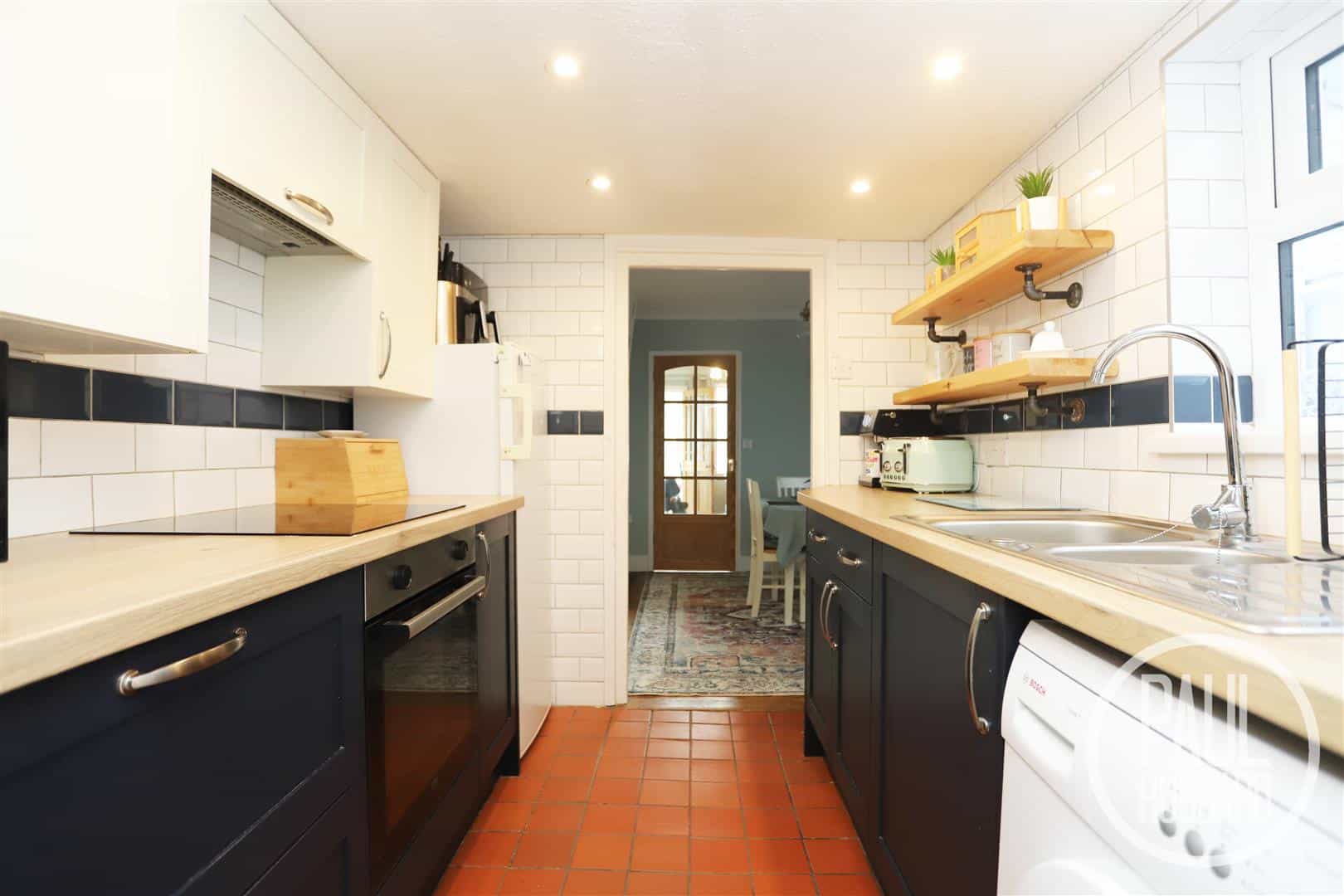 Tile flooring, UPVC double glazed window to the side aspect, tiled walls, units above & below, laminate work surfaces, inset stainless steel sink & drainer with mixer tap, built-in oven, ceramic hob & extractor hood, space for a fridge-freezer & washing machine and a door opens into the bathroom.
