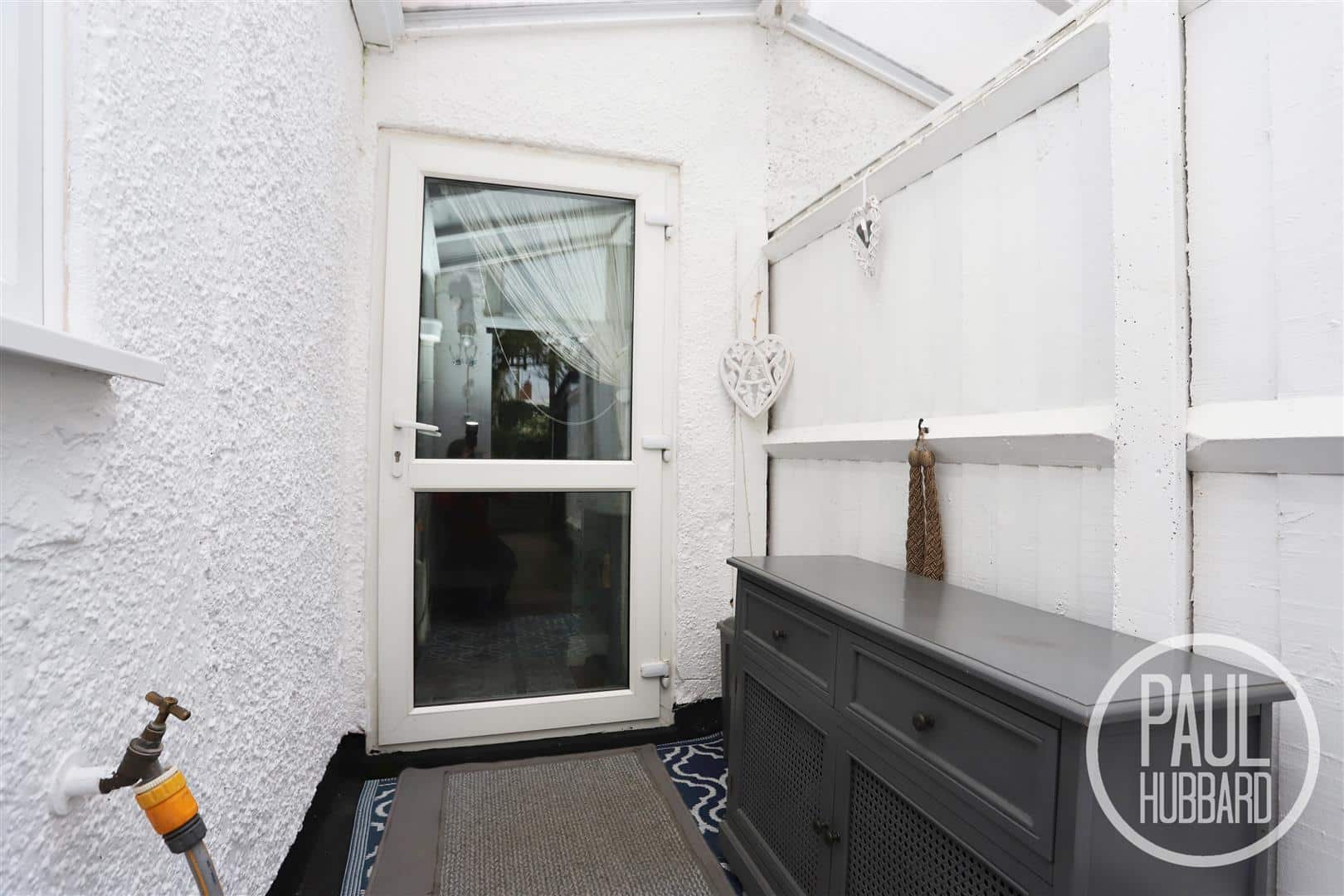 A sheltered lean to with secure storage space, or space for a small table & chairs, a tap, lighting and a door opening to the rear garden.