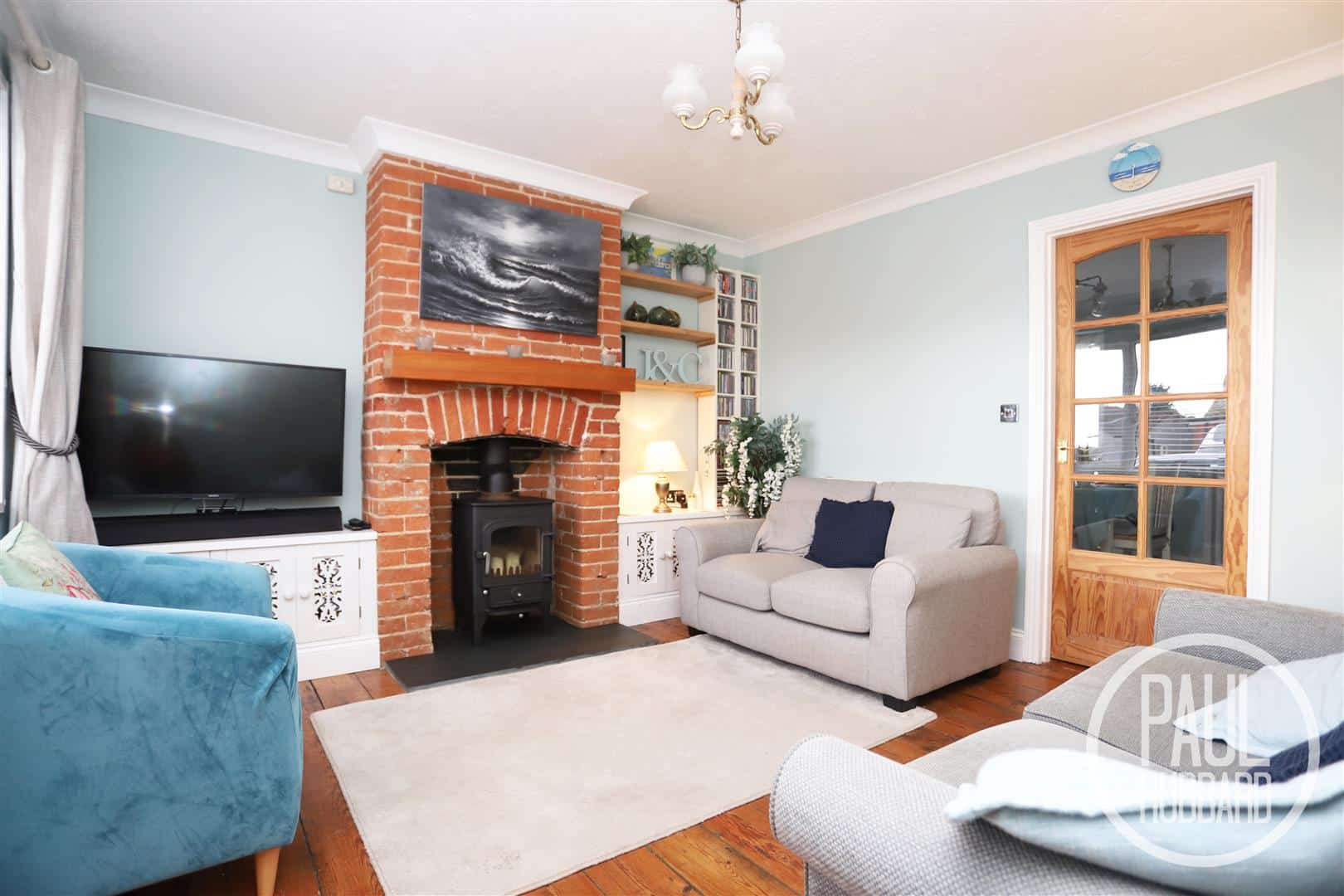 Exposed floorboards, UPVC double glazed window to the front aspect, radiator, wood burner and a door opens into the dining room.