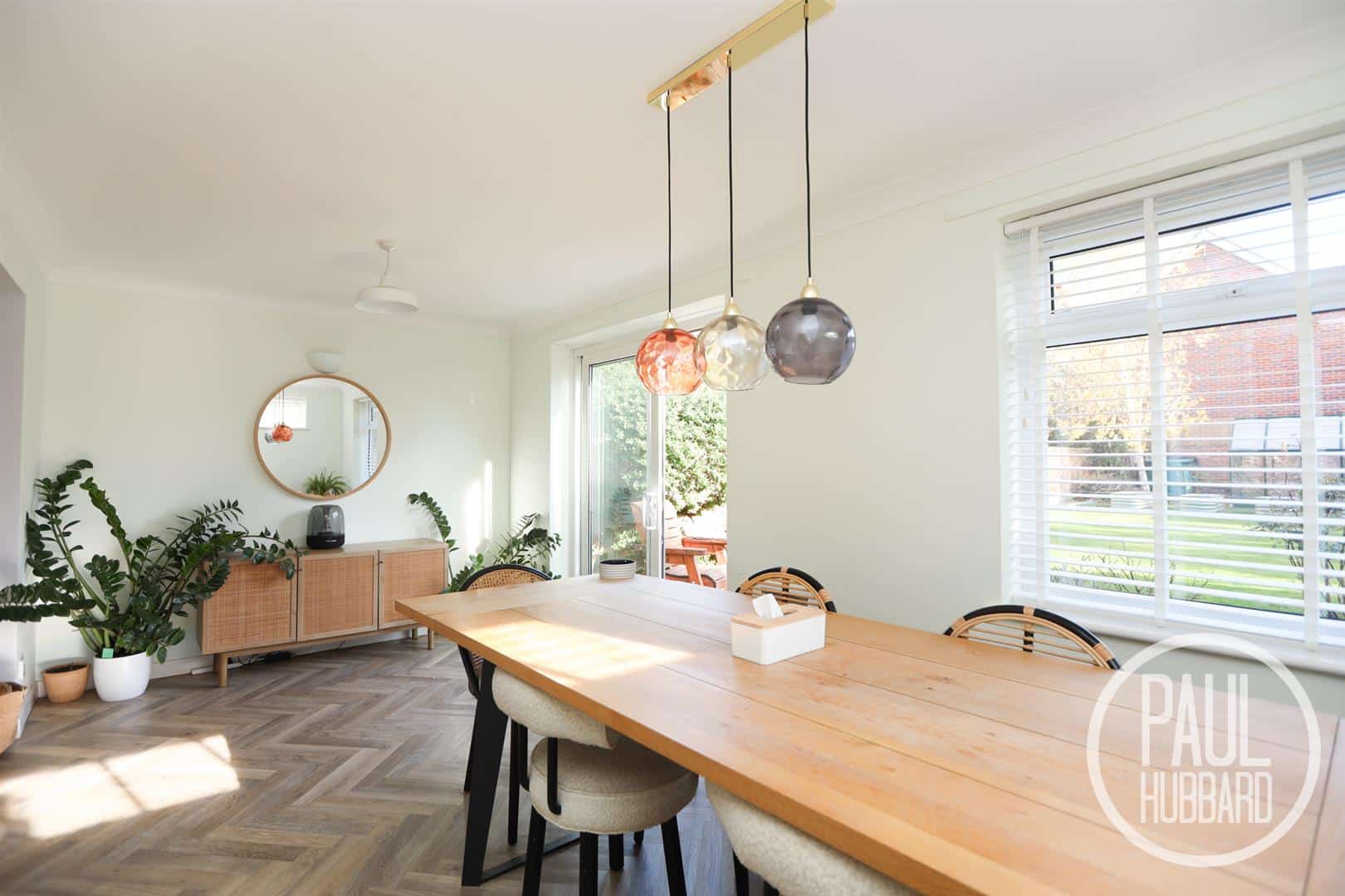 Herringbone LVT flooring, x2 dual aspect UPVC double glazed windows, radiator, space for a large table, feature pendant lighting and a UPVC sliding door opens to the rear garden.
