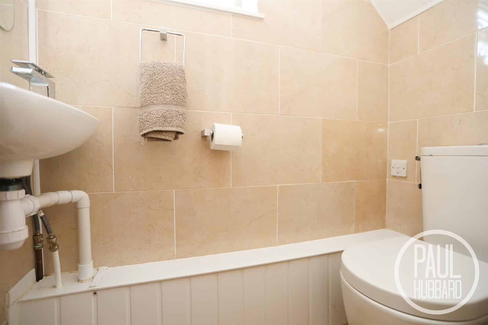 Laminate flooring, UPVC double glazed obscure window to the side aspect, heated towel rail, toilet, wall-mounted wash basin with mixer tap and tiled walls.