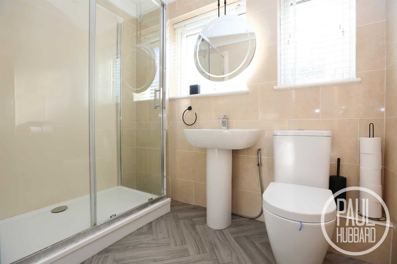Herringbone style vinyl flooring, x2 UPVC double glazed obscure windows to the side aspect, heated towel rail, tiled walls, spotlights, extractor fan, toilet, pedestal wash basin with hot & cold taps, mains-fed shower with both handheld & rainfall heads set into a large cubicle enclosure and aqua board wall panels.