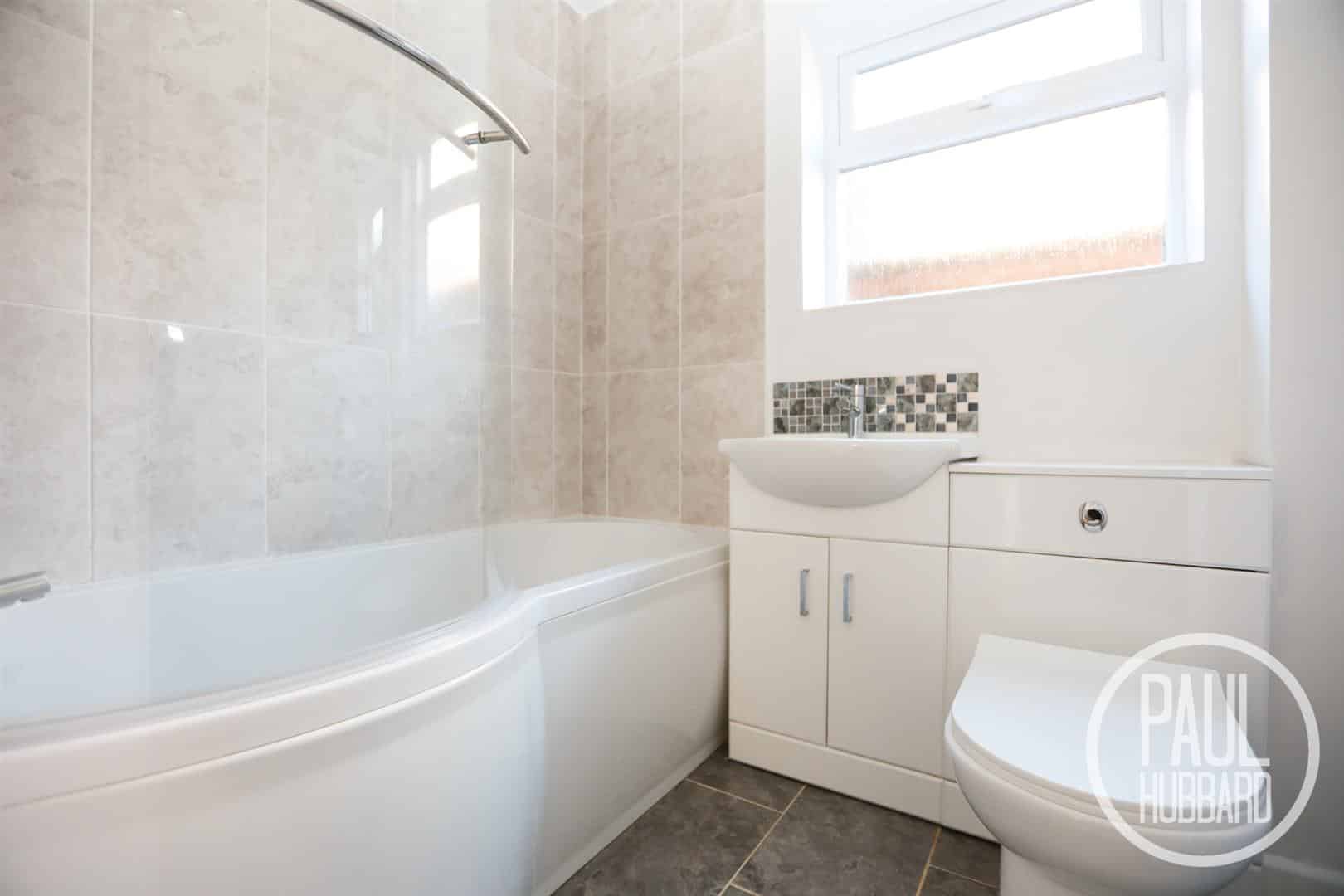 UPVC double glazed obscure window to the side aspect, tiled flooring throughout, part tiled walls, vanity unit with inset sink and toilet, bath with over head shower and a heated towel rail.