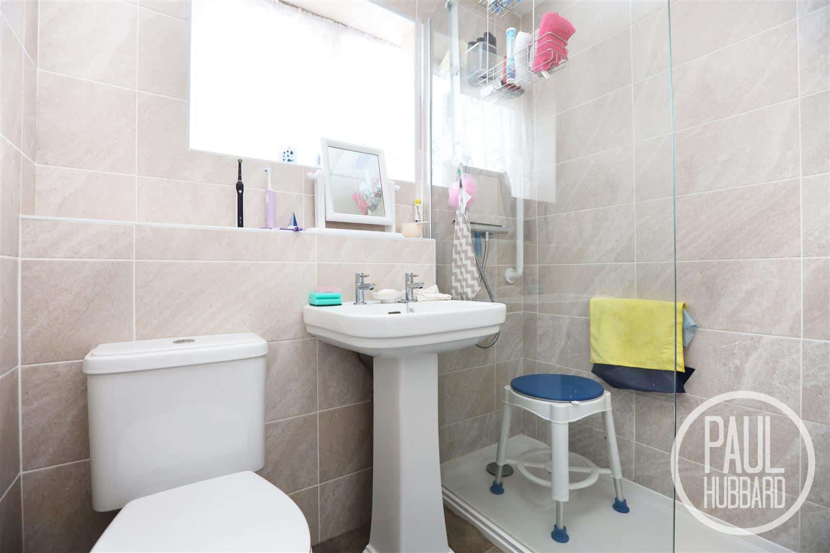 UPVC double glazed obscure window to the side aspect, vinyl flooring throughout, tiled walls, shower within glass cubicle, pedestal wash basin, toilet and a heated towel rail.