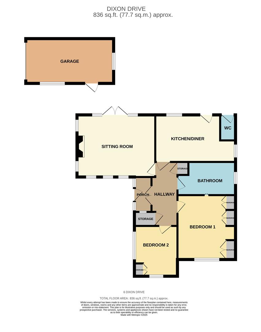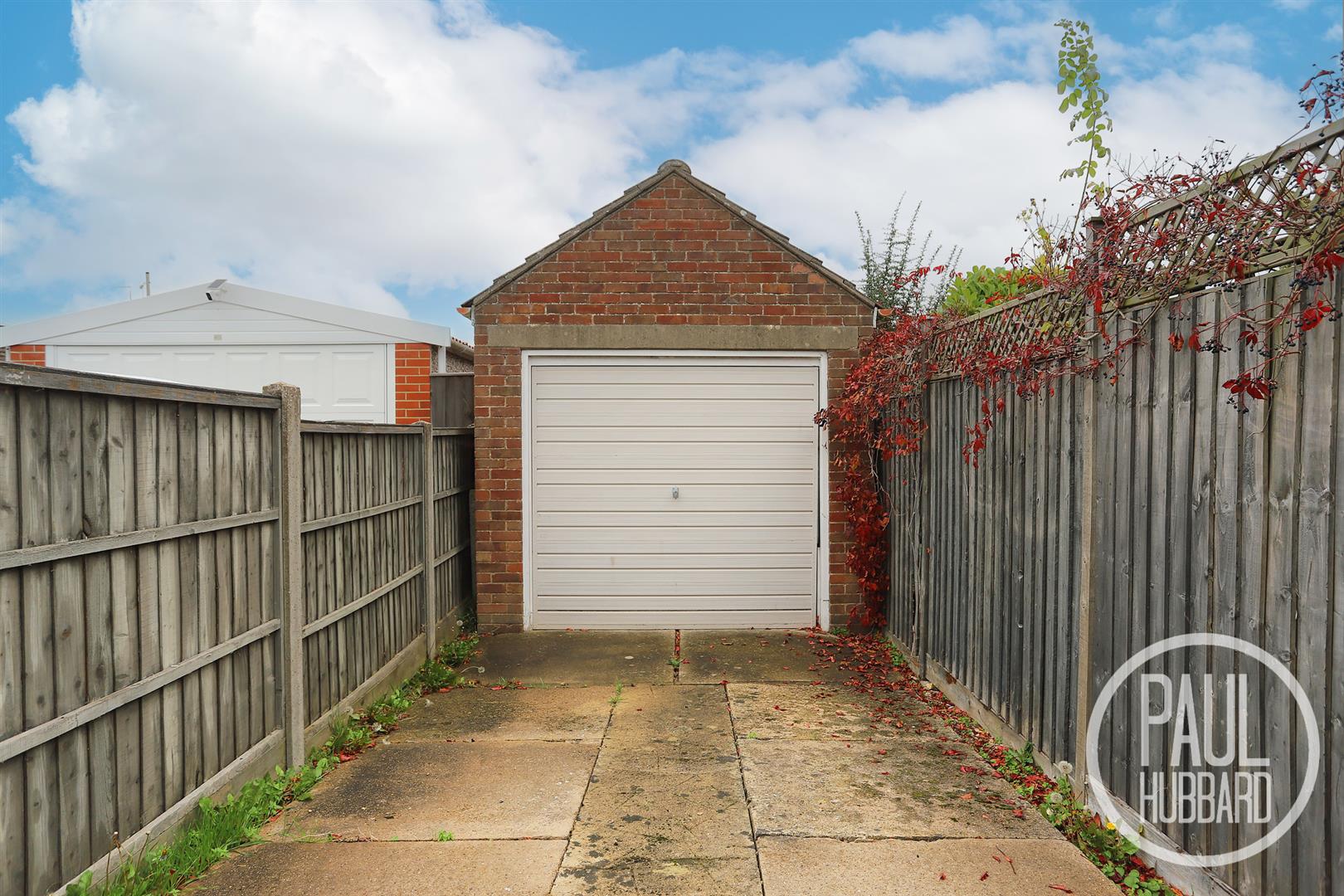 A solid brick-built garage offering excellent storage or parking space, with dual-aspect timber windows, an up-and-over front door, and a pedestrian access door from the rear garden.