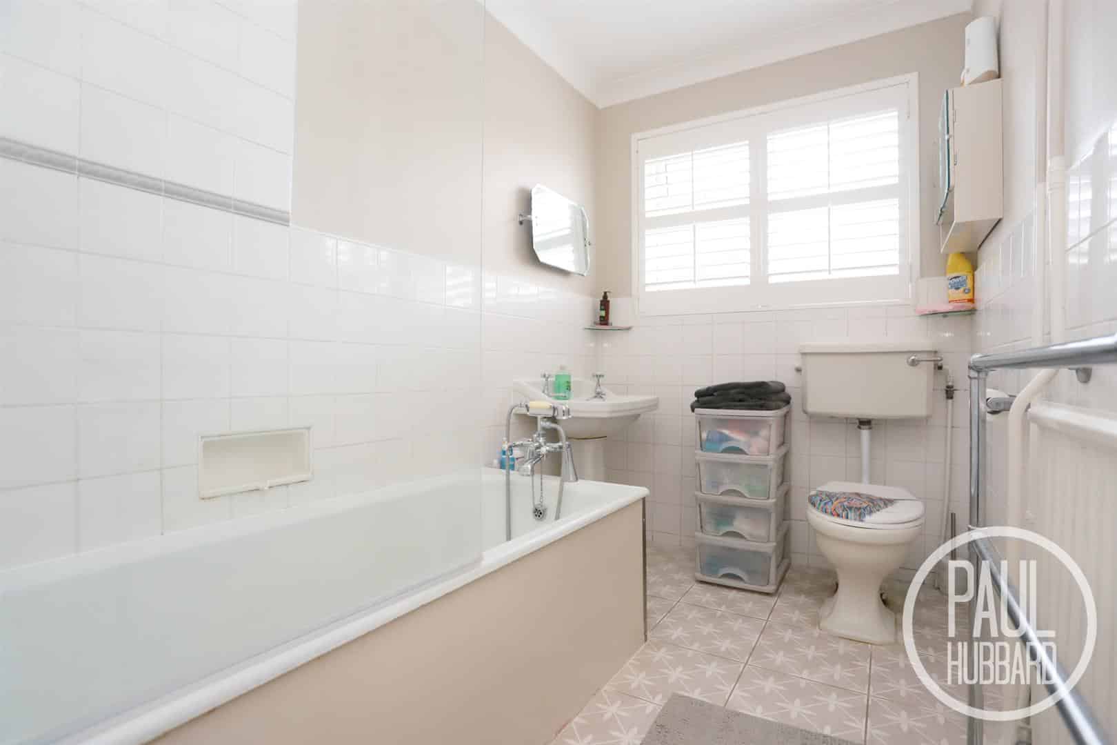 UPVC double glazed window to the side aspect, tiled flooring throughout, underfloor heating, part tiled walls, a radiator, toilet, pedestal wash basin and a bath with overhead shower.