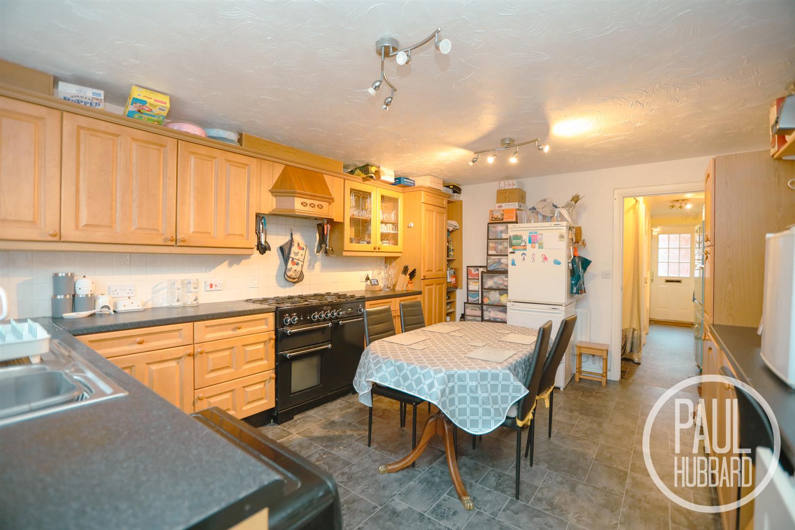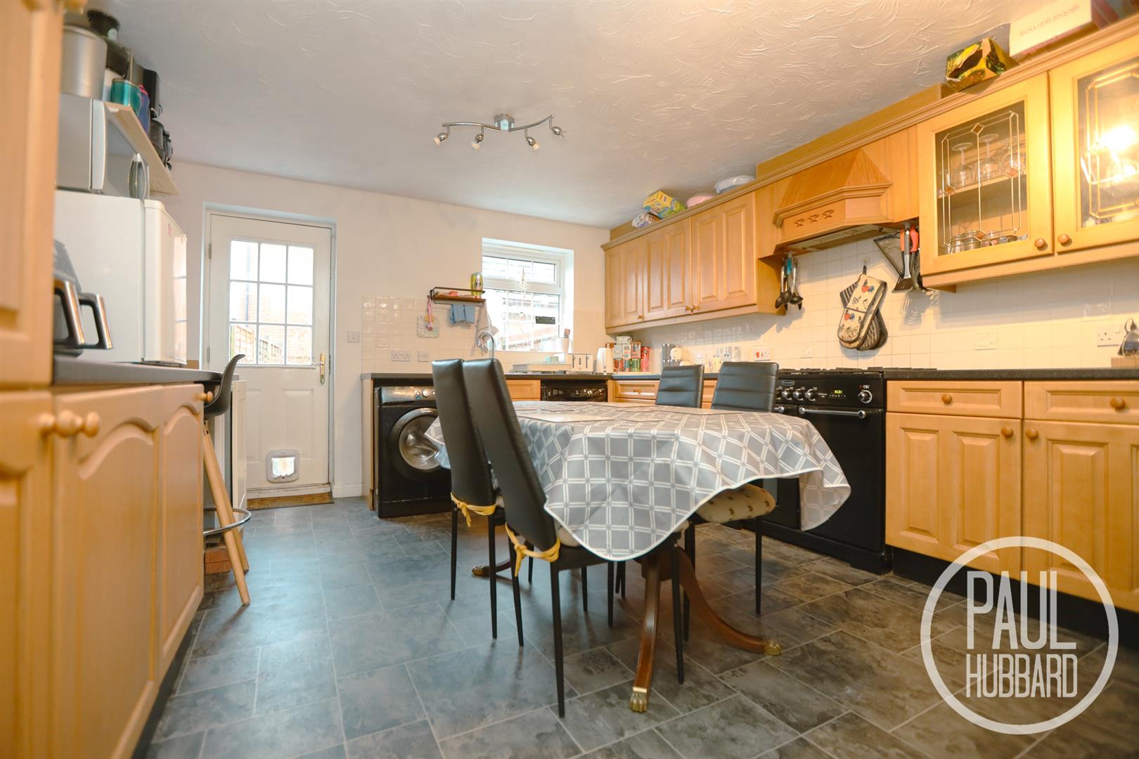 A sizeable room with UPVC double glazed window and door to the rear aspect opening into the garden, vinyl flooring throughout, part tile walls, radiator, units above and below, laminate work surfaces, stainless steel sink with drainer, extractor fan, Rangemaster oven, space for appliances including a washing machine, dishwasher and fridge/freezer.