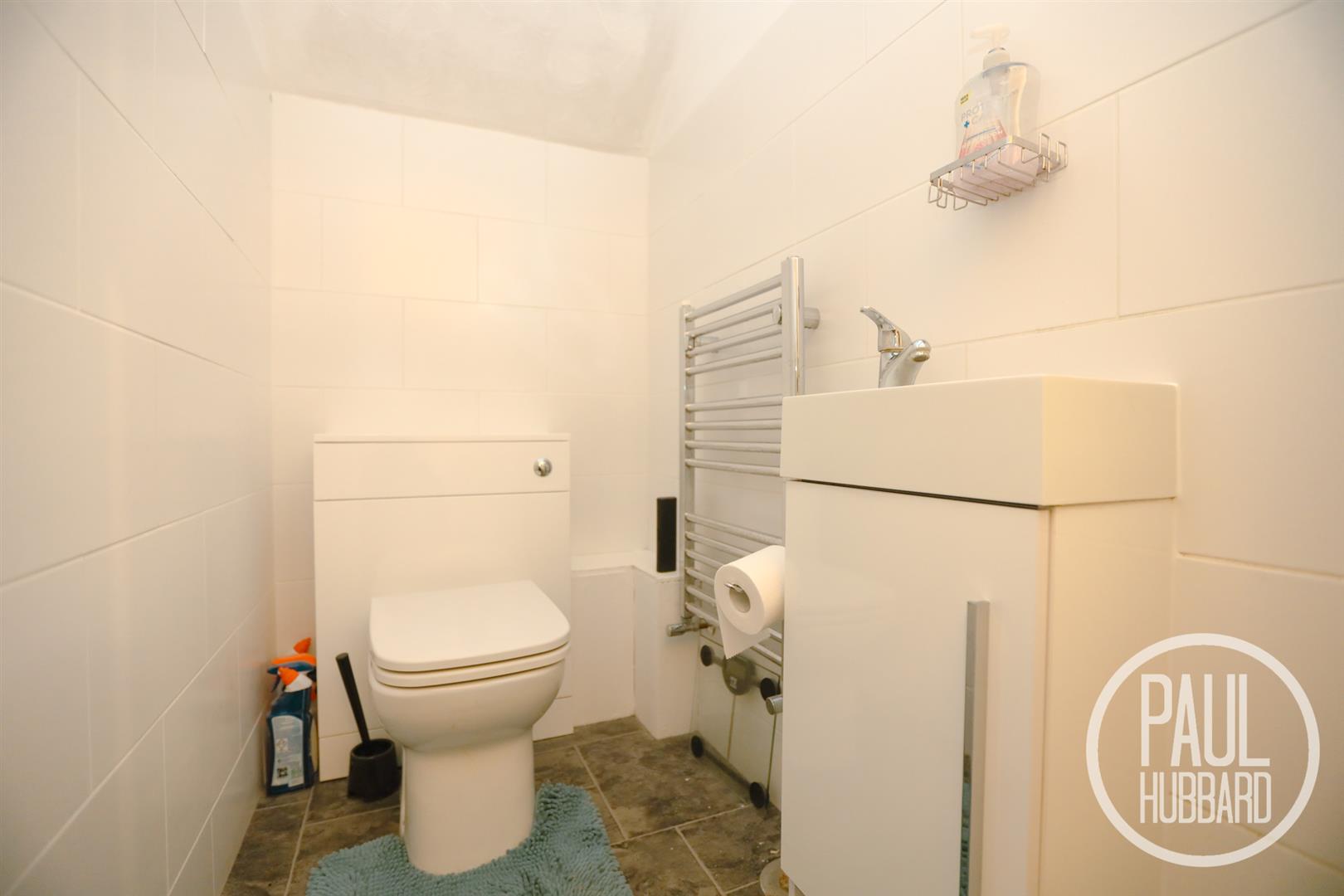 Vinyl flooring throughout, part tile walls, a heated towel rail, slimline vanity unit with inset hand wash basin and toilet.