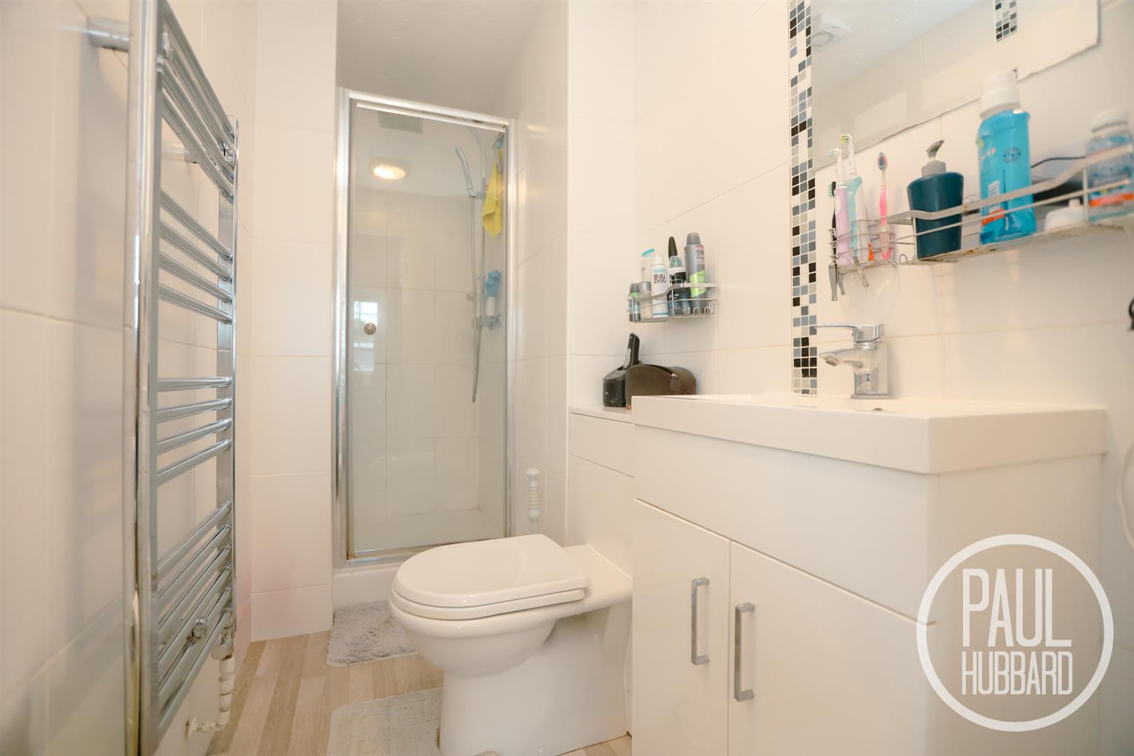 Tile walls, vinyl flooring, a heated towel rail, vanity unit with inset hand wash basin and toilet with hidden cistern, mains fed rainfall shower with handheld attachment, enclosed within a glass and tiled cubicle.