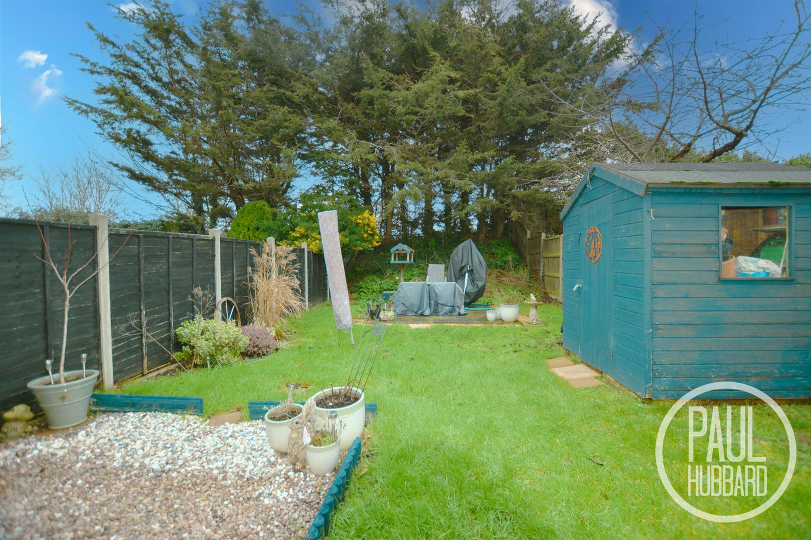 The rear garden features a laid lawn, shingle and patio seating areas, enclosed by panel fencing, with a timber storage shed, outdoor tap and mature trees forming an attractive rear boundary.