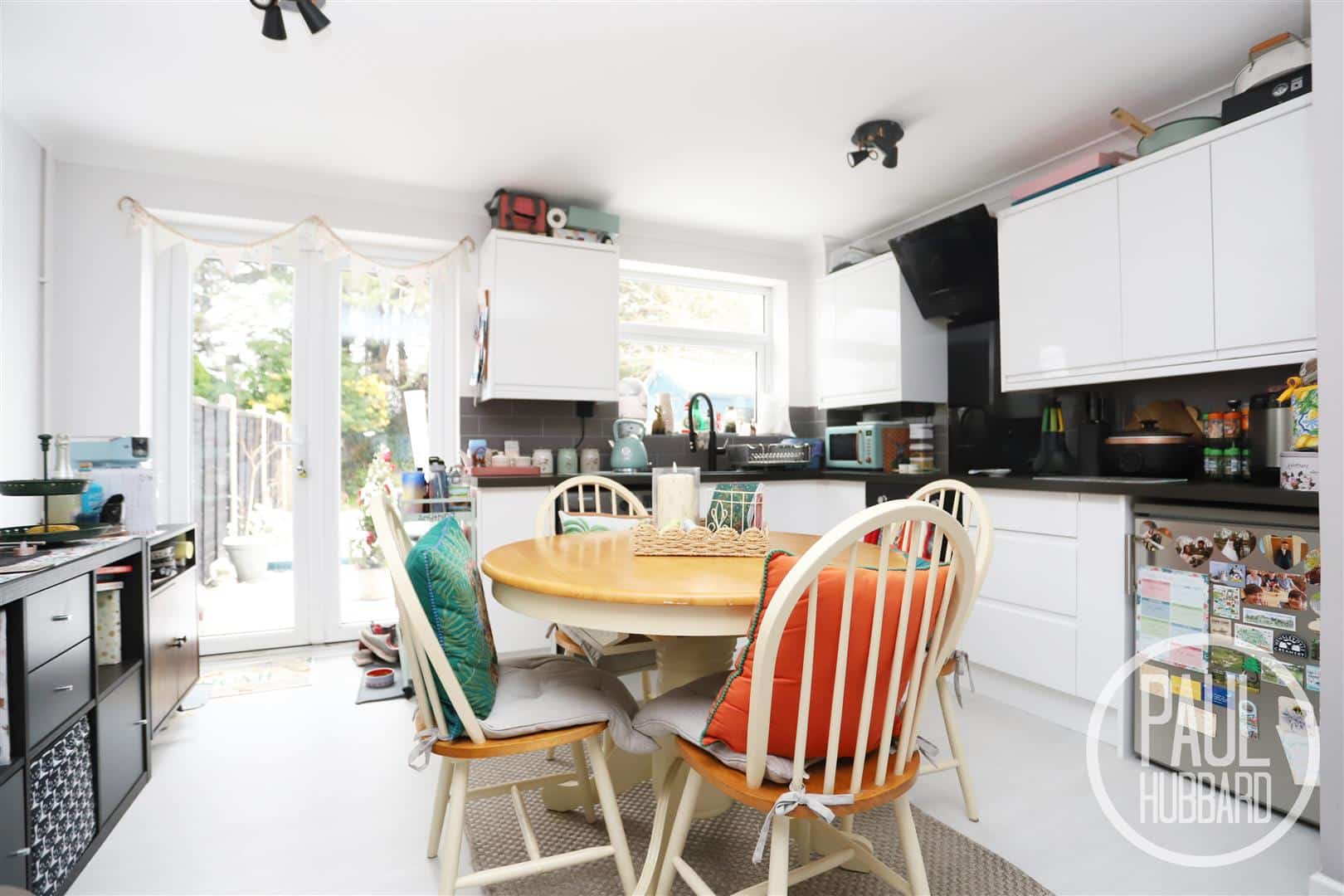 LVT flooring, UPVC double glazed bay fronted window (with privacy film), UPVC double glazed window to the rear aspect, x2 radiators, under-stair storage cupboard, units above & below, laminate work surfaces, tile splash backs, built-in oven, induction hob, extractor hood, space for a fridge & washing machine and UPVC French doors open to the rear garden.