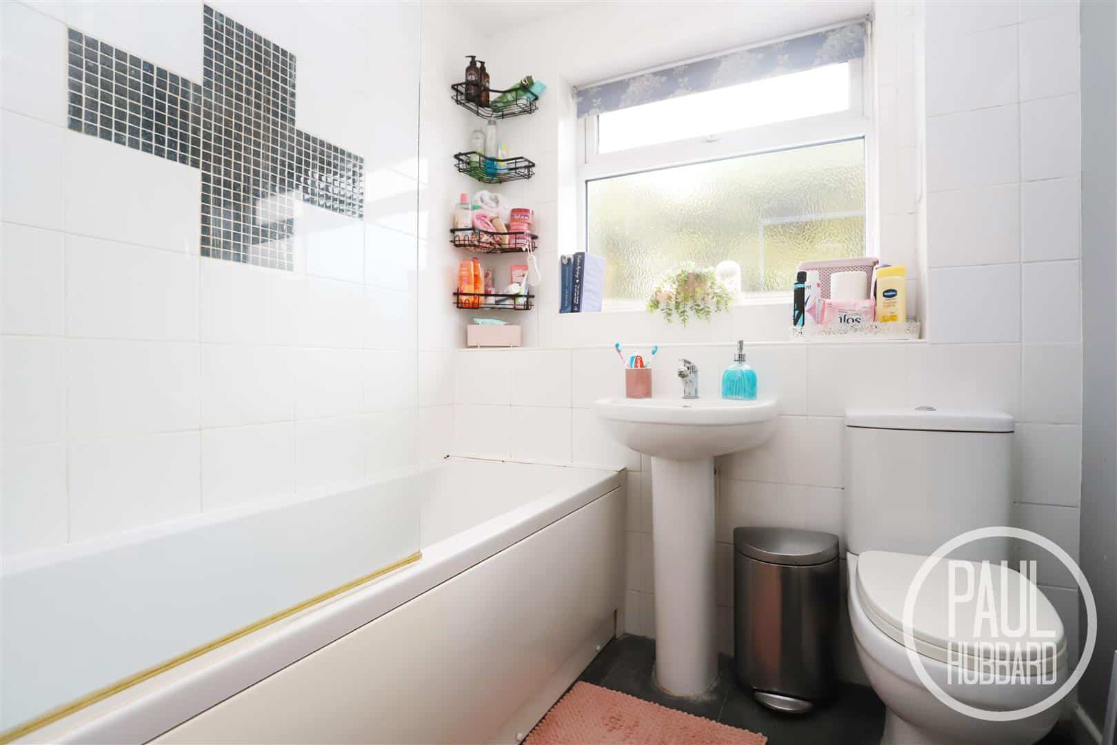 Vinyl flooring, UPVC double glazed obscure window to the rear aspect, part tiled walls, radiator, toilet, pedestal wash basin with mixer tap, panelled bath with hot & cold taps and a mains-fed shower set above.