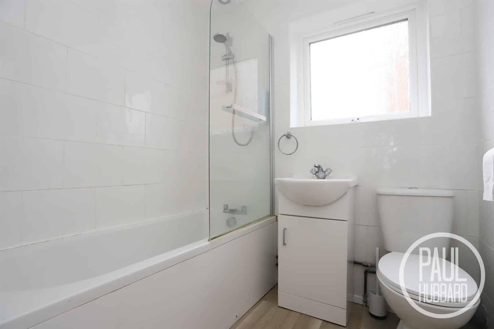 Vinyl flooring, UPVC double glazed obscure window to the side aspect, heated towel rail, extractor fan, toilet, wash basin set into a vanity unit with a mixer tap, a panelled bath with a mixer tap, an electric shower set above and tile splash backs.