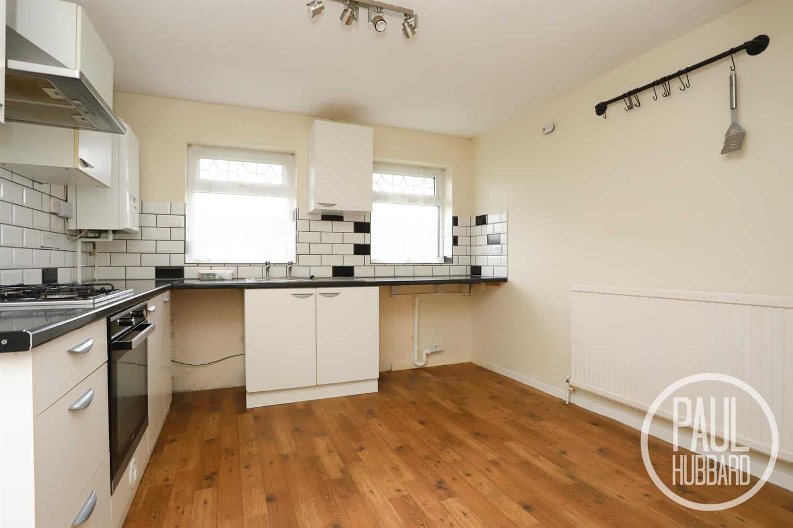 Laminate flooring, x3 dual aspect UPVC double glazed windows, radiator, built-in storage cupboard, units above & below, laminate work surfaces, tile splash backs, inset stainless steel sink & drainer with hot & cold taps, built-in oven, gas hob & stainless steel extractor fan, gas combi boiler, space for a washing machine & fridge-freezer and a UPVC door opens out to the rear garden.