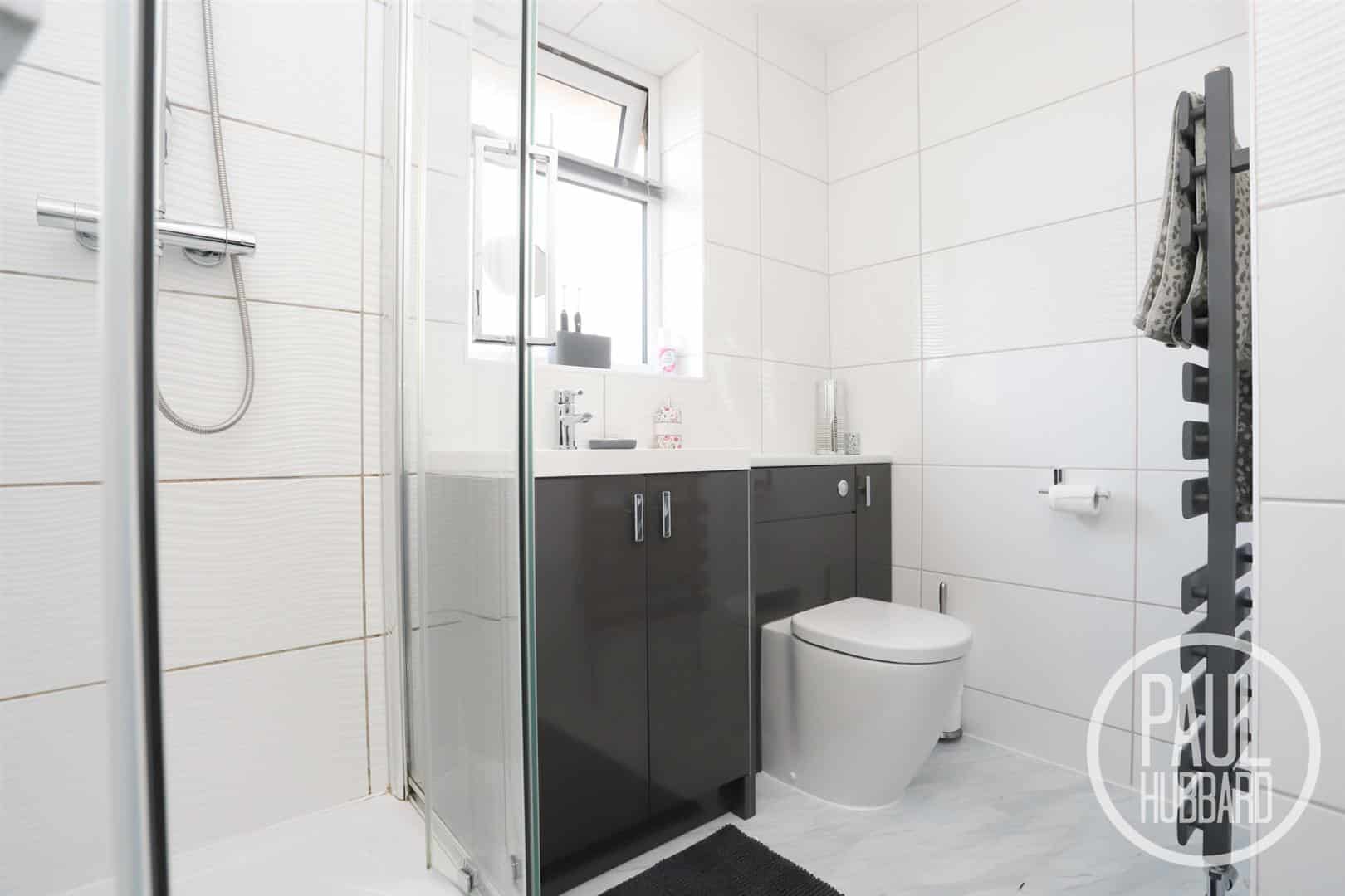 UPVC double glazed obscure window to the side aspect, vinyl tiled flooring throughout, tiled walls, shower within an enclosed glass cubicle, vanity unit with inset sink and toilet, heated towel rail and built in storage.