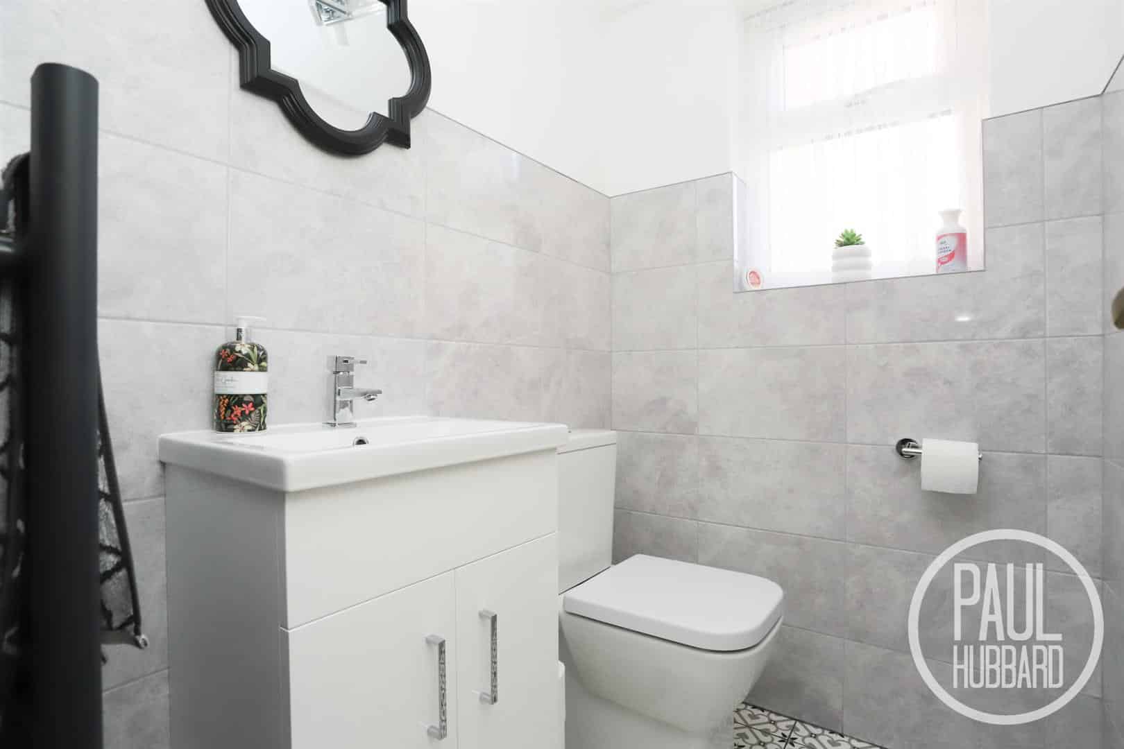 UPVC double glazed obscure window to the side aspect, tiled flooring throughout, toilet, vanity unit with inset sink and a heated towel rail.