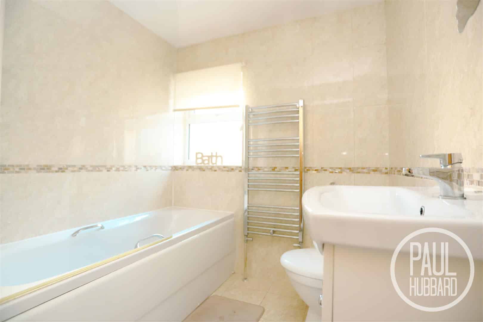 Tiled floors & walls, UPVC double glazed obscure window to the side aspect, heated towel rail, toilet, wash basin set into a vanity unit with a mixer tap, a panelled bath with a mixer tap and a hand-held shower attachment.