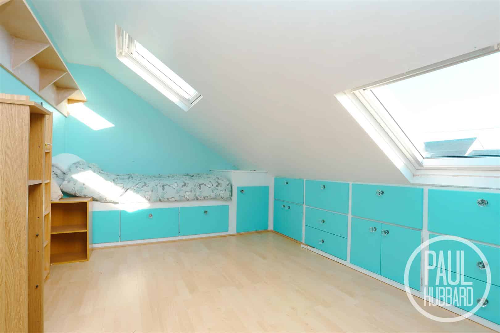 Laminate flooring, x2 Velux windows with fitted blinds, radiator and built-in eaves storage spaces.