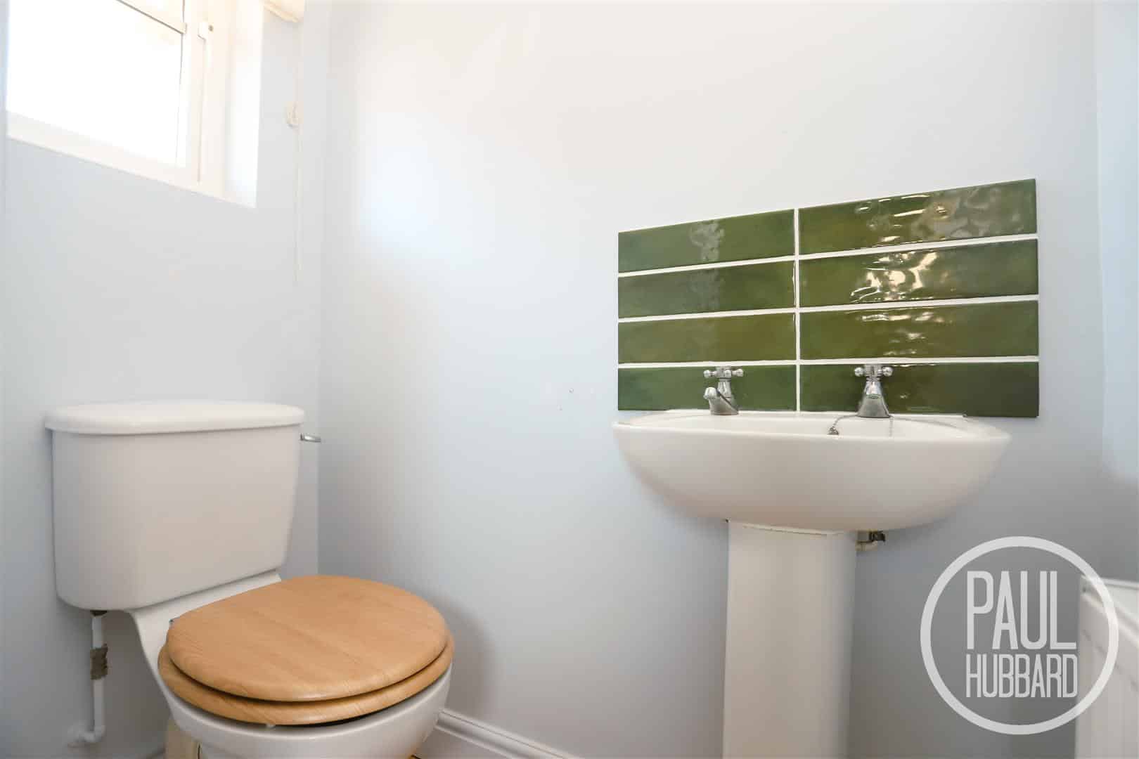Vinyl flooring, UPVC double glazed obscure window to the front aspect, radiator, consumer unit, toilet, pedestal wash basin with hot & cold taps and tile splash backs.