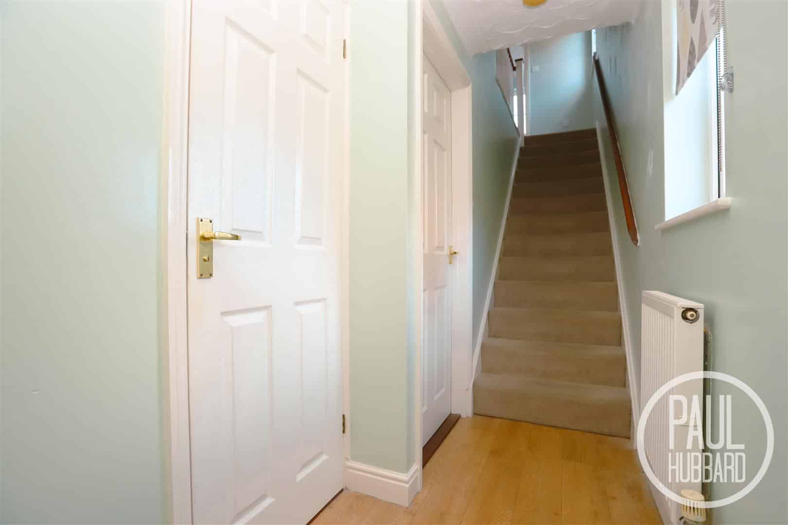 Entrance door to the front aspect, vinyl flooring, UPVC double glazed window to the side aspect, radiator, doors opening to the cloakroom & sitting room and stairs lead up to the first floor landing.