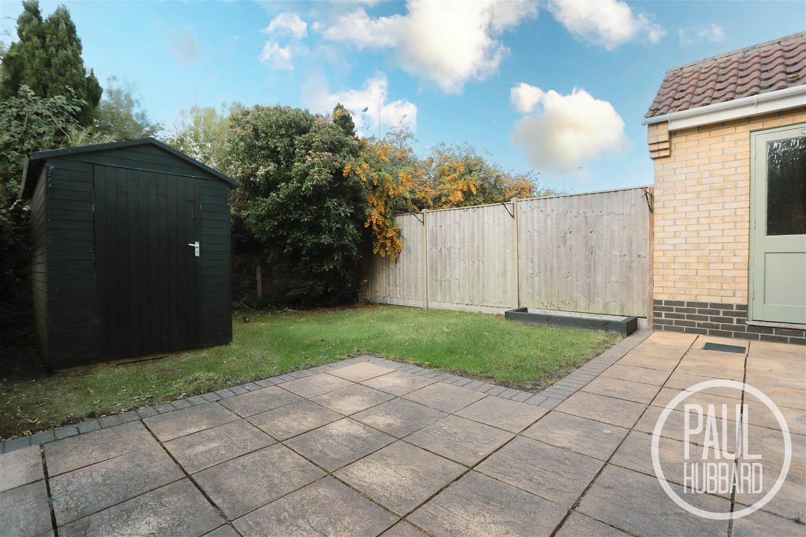 West-facing rear garden with lawn, patio area, timber storage shed, outdoor tap, and pedestrian access to the garage.