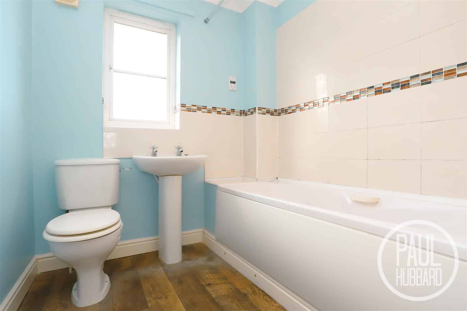Vinyl flooring, UPVC double glazed obscure window to the rear aspect, radiator, shaving point, extractor fan, tile splash backs, toilet, pedestal wash basin with hot & cold taps, a panelled bath with a mixer tap & a handheld shower attachment.