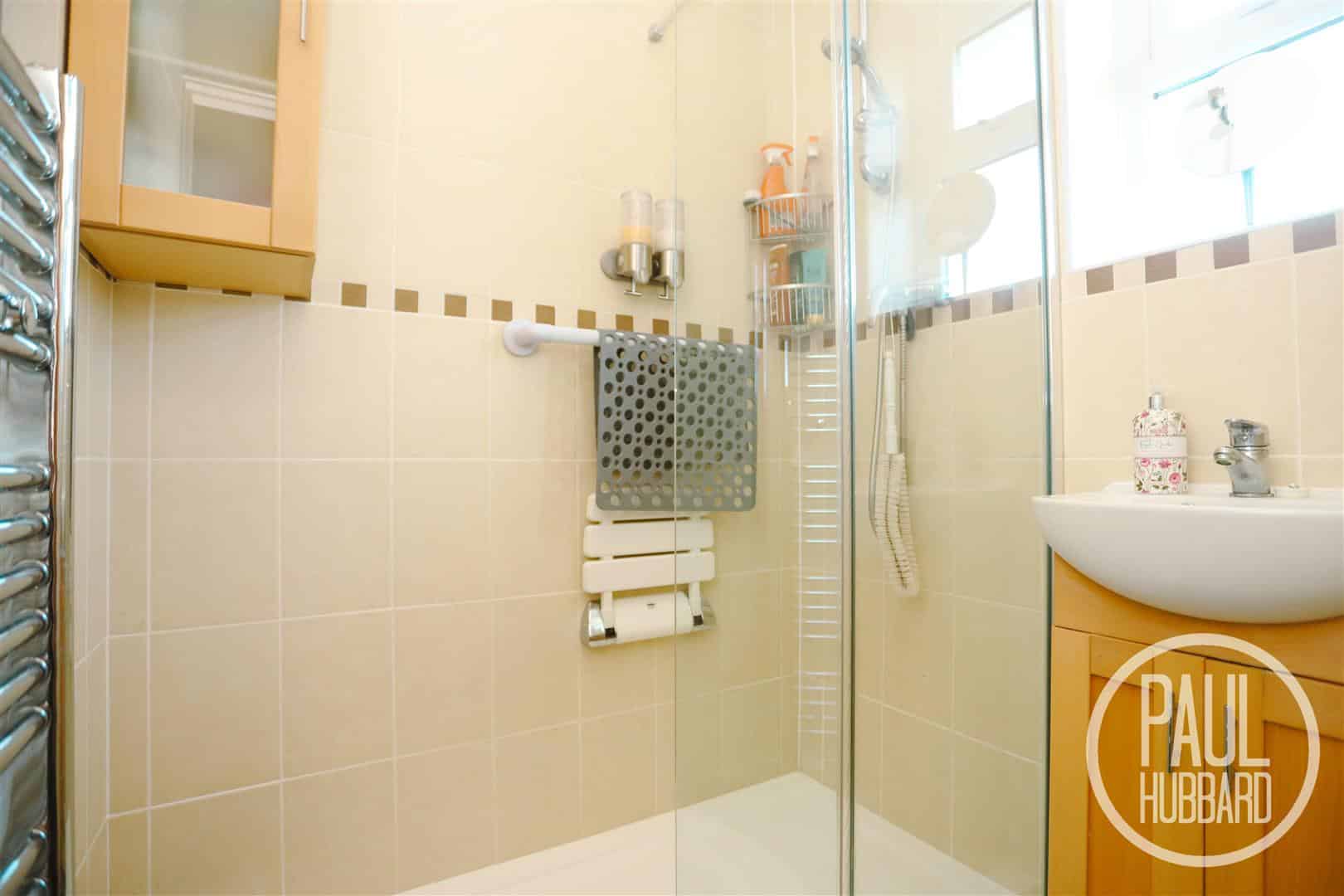Tiled flooring & walls, extractor fan, UPVC double glazed obscure window to the rear aspect, heated towel rail, wash basin set into a vanity unit with a mixer tap, a walk-in mains fed shower with a glass screen.