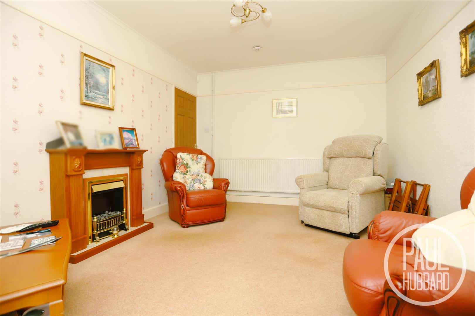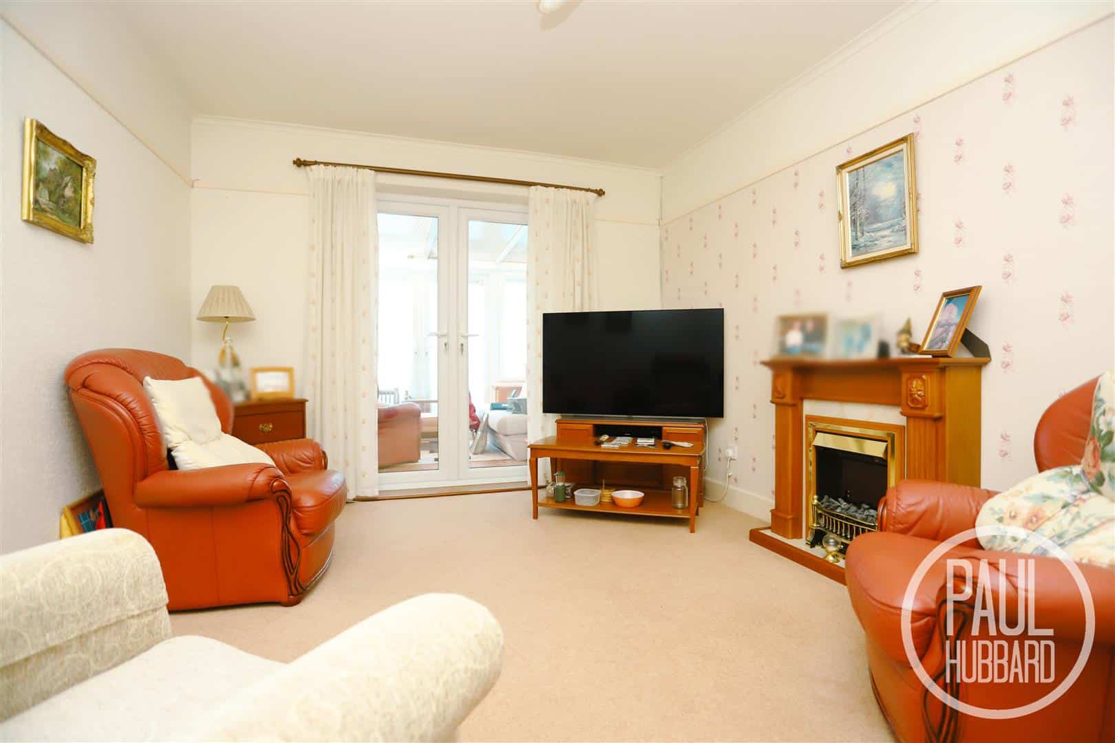 Fitted carpet, radiator, fireplace and UPVC French doors opening to the conservatory.