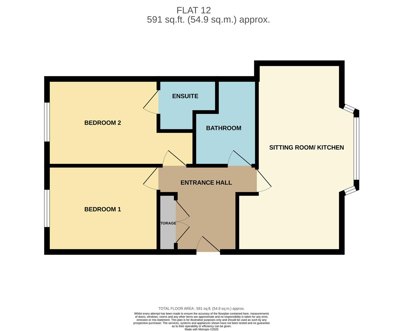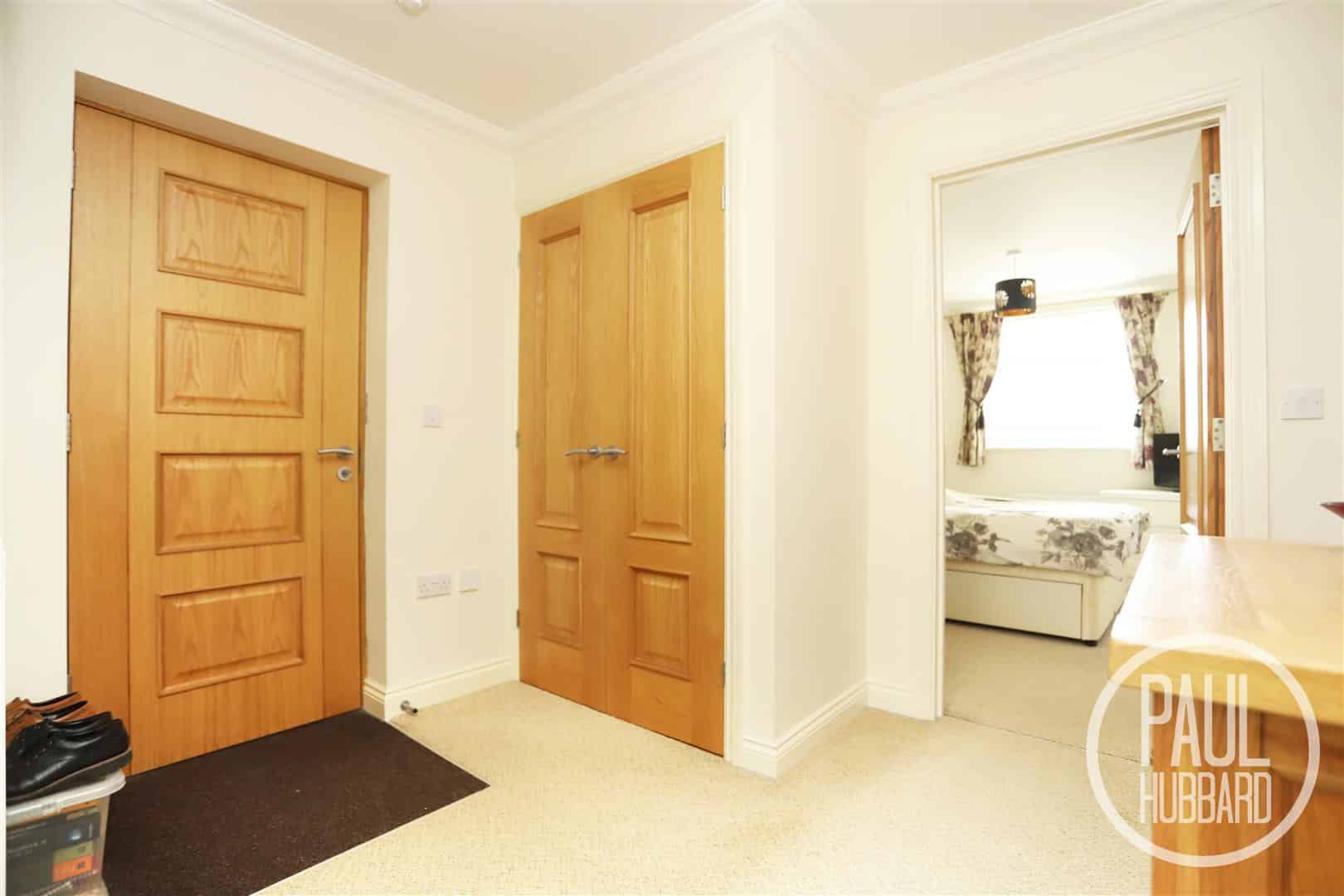Entrance door to the front aspect, carpet flooring throughout, a radiator, and doors leading to the open-plan sitting room/kitchen, bathroom, bedrooms one and two, and a storage cupboard.