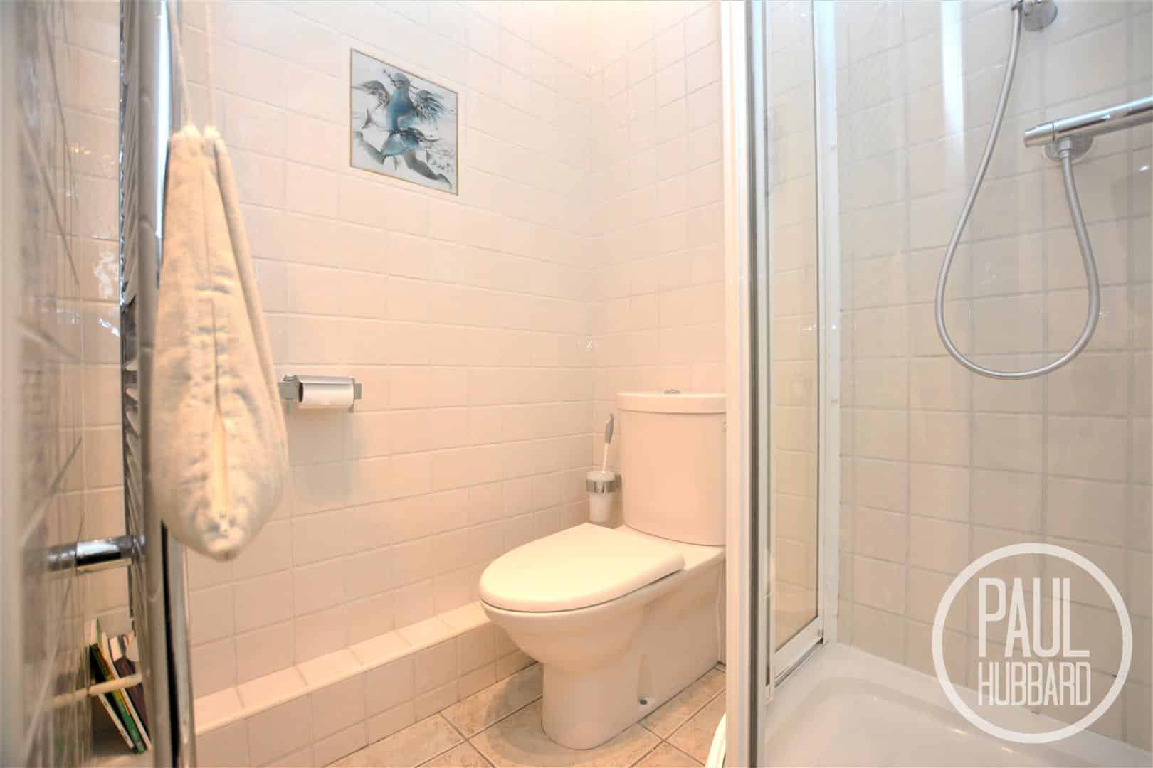 Tiled walls & flooring, spotlights, extractor fan, heated towel rail, fitted storage cupboard, suite comprises a toilet, wall mounted wash basin with mixer tap and a mains fed shower set into a cubicle enclosure.