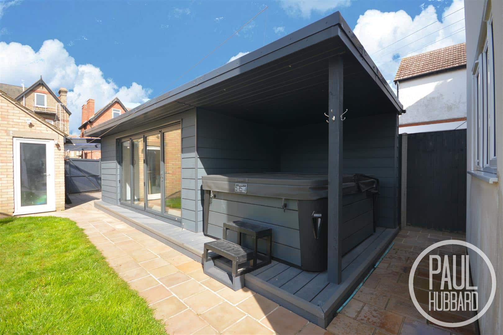 A sheltered entertaining area to the front aspect with space for a Jacuzzi (current one negotiable). UPVC double glazed bi-fold doors to side aspect, laminate flooring, power points, sliding door opening to shower room with UPVC double glazed window to rear aspect, laminate flooring, slimline vanity unit with inset wash basin and electric shower enclosed within a glass cubicle.