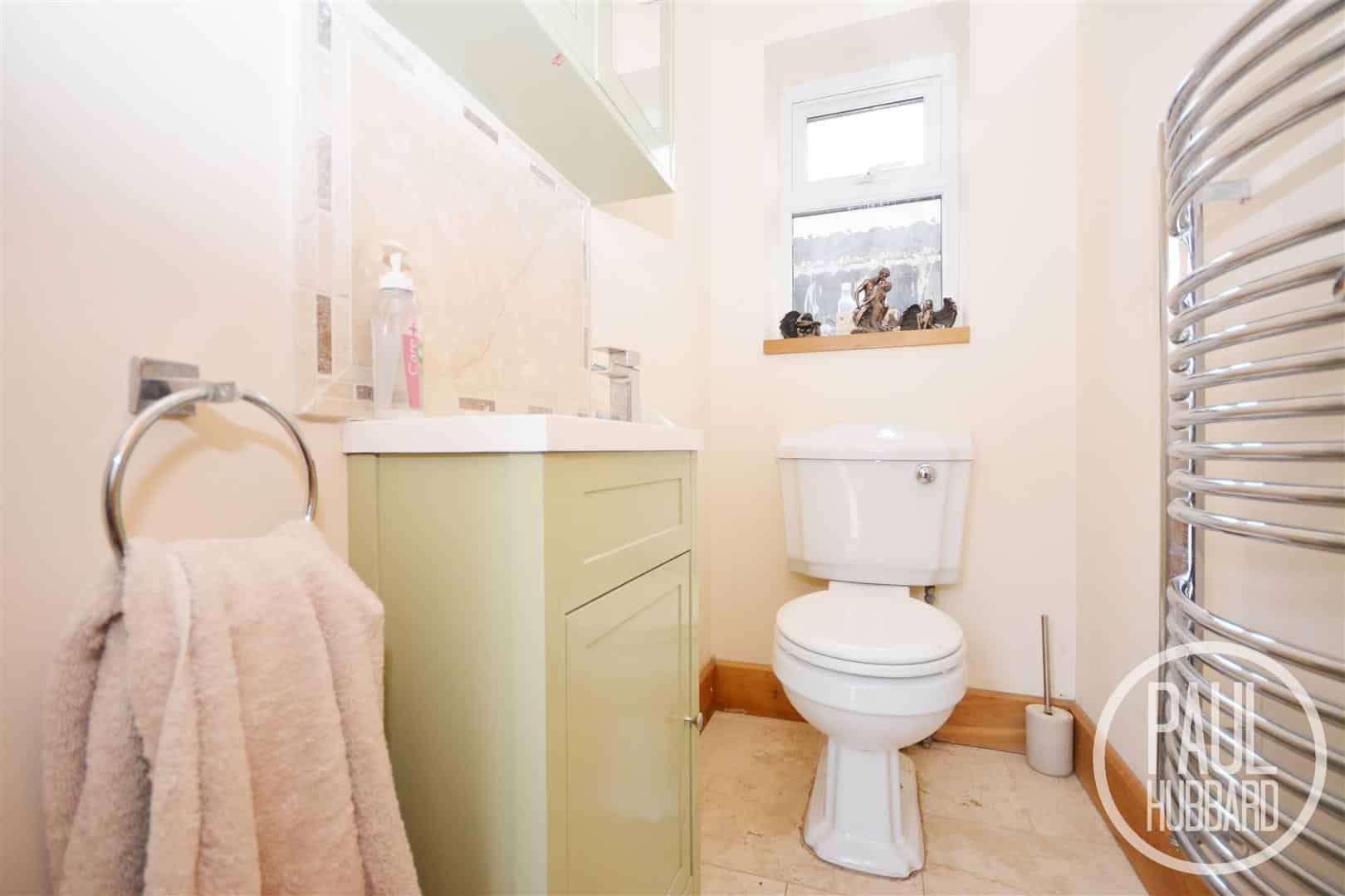 UPVC double glazed window to side aspect, tile flooring, heated towel rail, toilet, slimline vanity unit with inset wash basin.