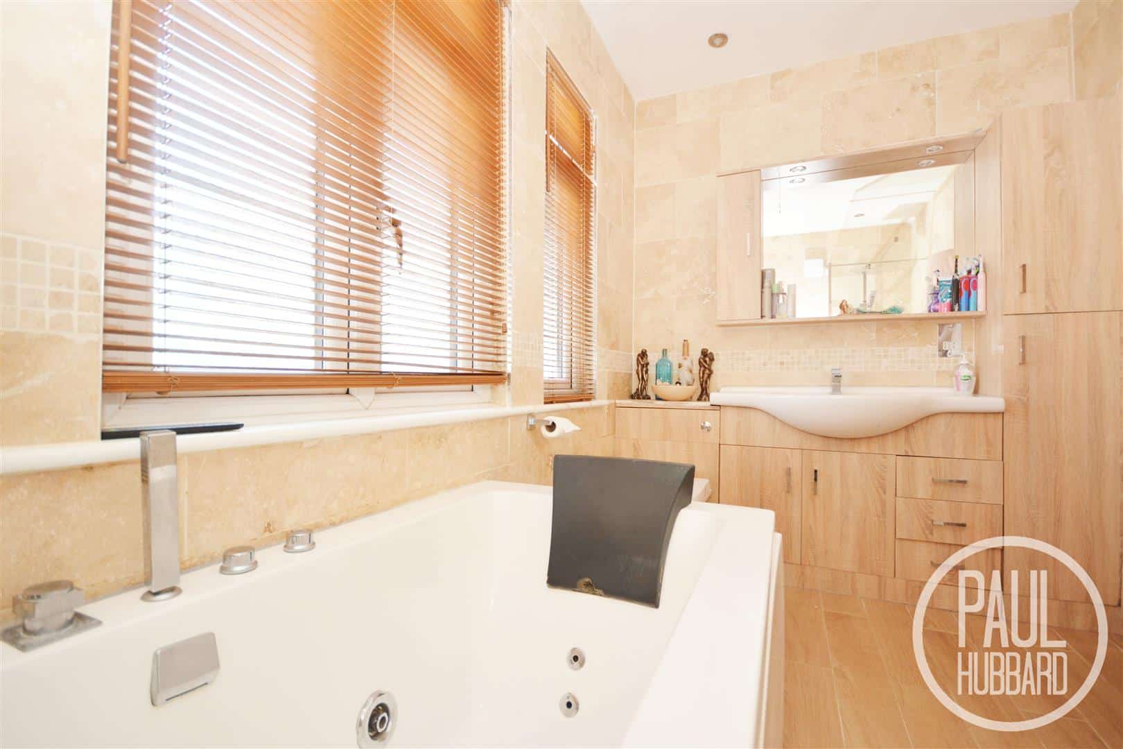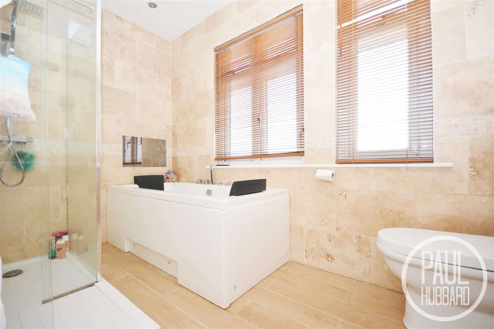 x2 UPVC double glazed windows to rear aspect, tile flooring, tile walls, heated towel rail, vanity unit with inset wash basin and toilet with hidden cistern, Jacuzzi bath, walk in mains fed rainfall shower with handheld attachment within a glass surround, integrated television.