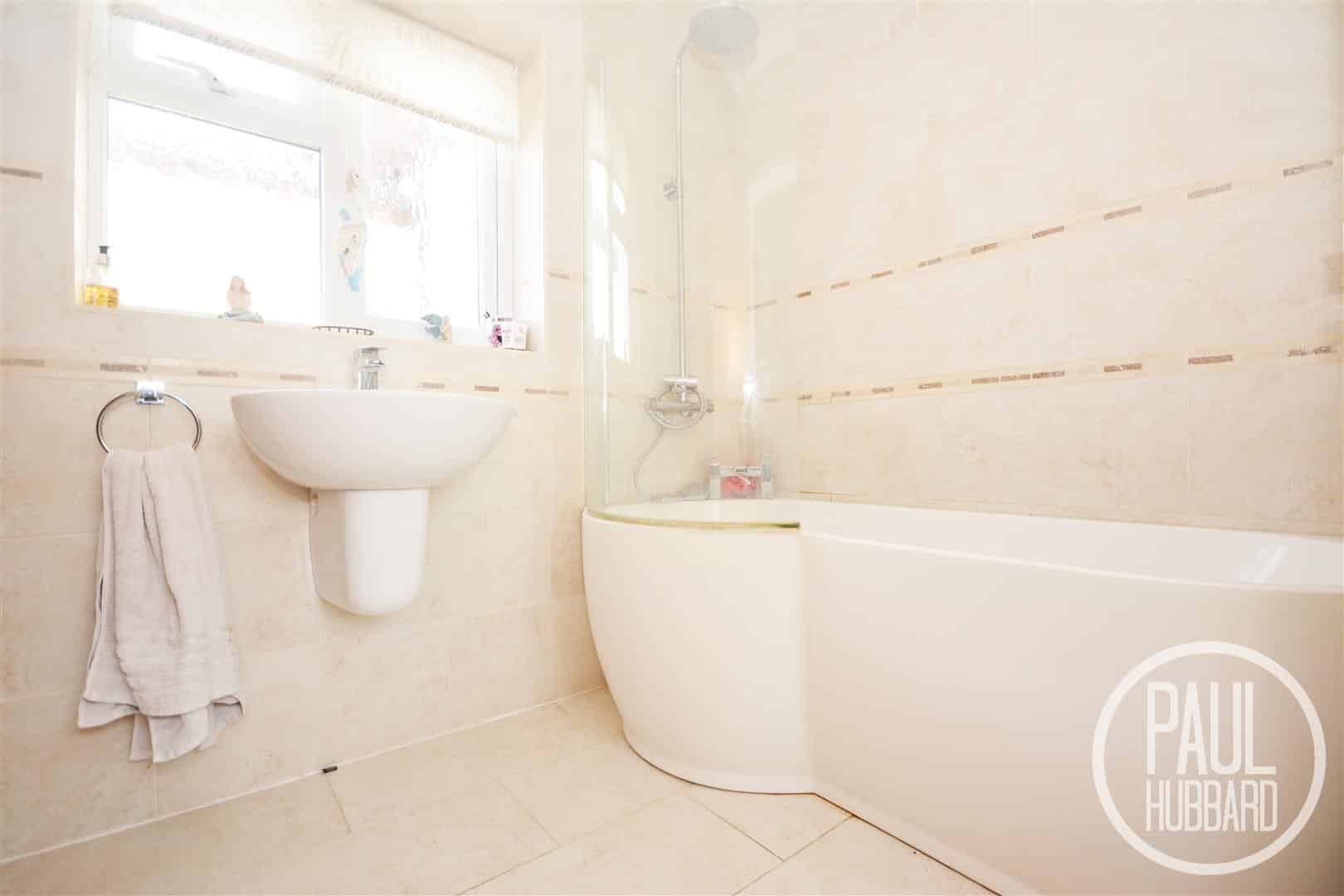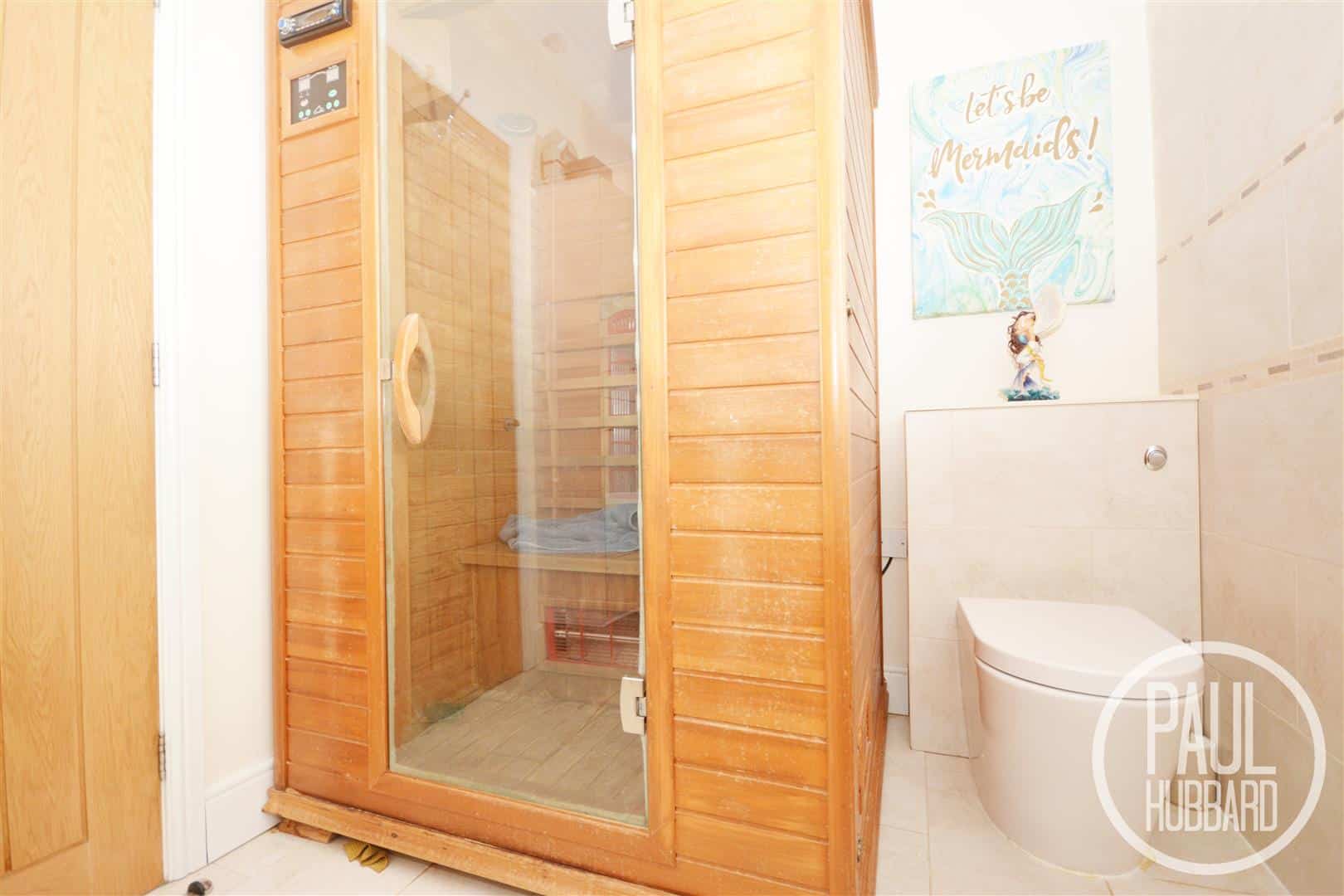 UPVC double glazed window to side aspect, tile flooring, tile walls, heated towel rail, toilet, sauna (negotiable) wall mounted hand wash basin, tall storage unit with mirror, p-shape bath with rainfall shower above and handheld attachment.