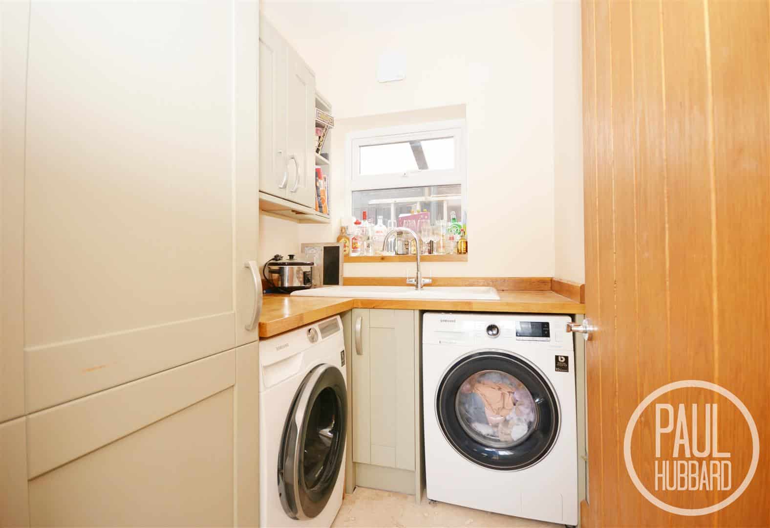 UPVC double glazed window to side aspect, tile flooring, radiator, units above and below, solid oak work surfaces, ceramic sink with drainer, space for appliances including a washing machine and tumble dryer.