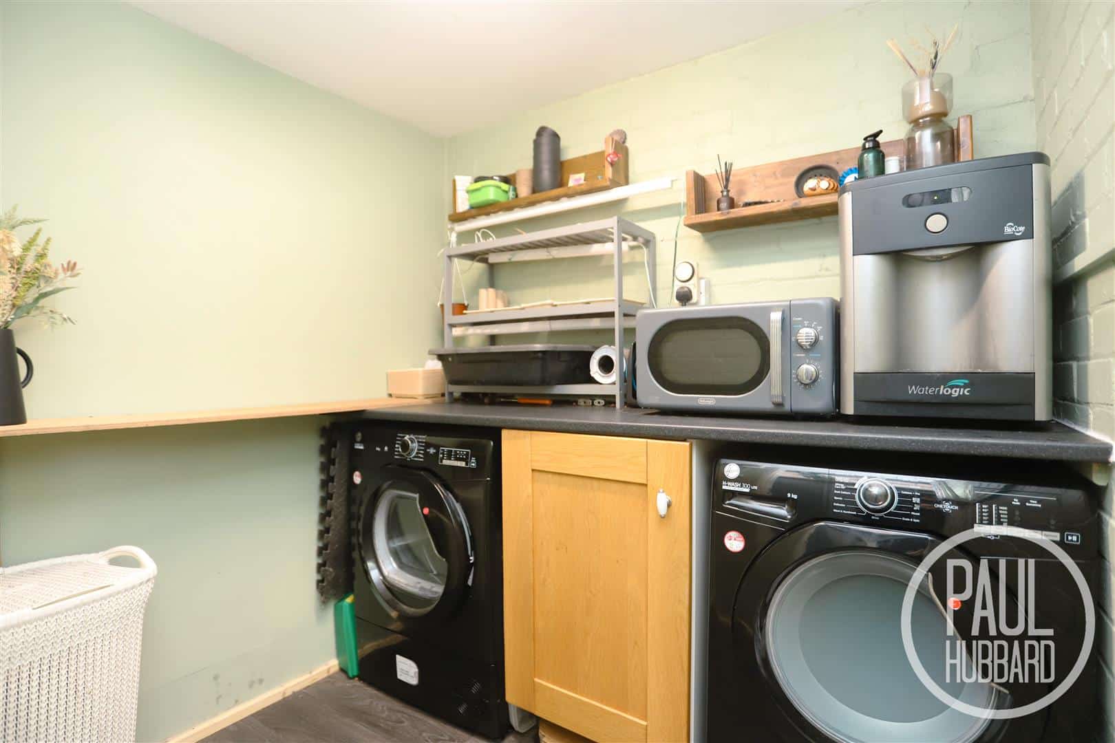 Laminate flooring, base unit, laminate work surface, space for a washing machine & tumble dryer, light & power sockets.