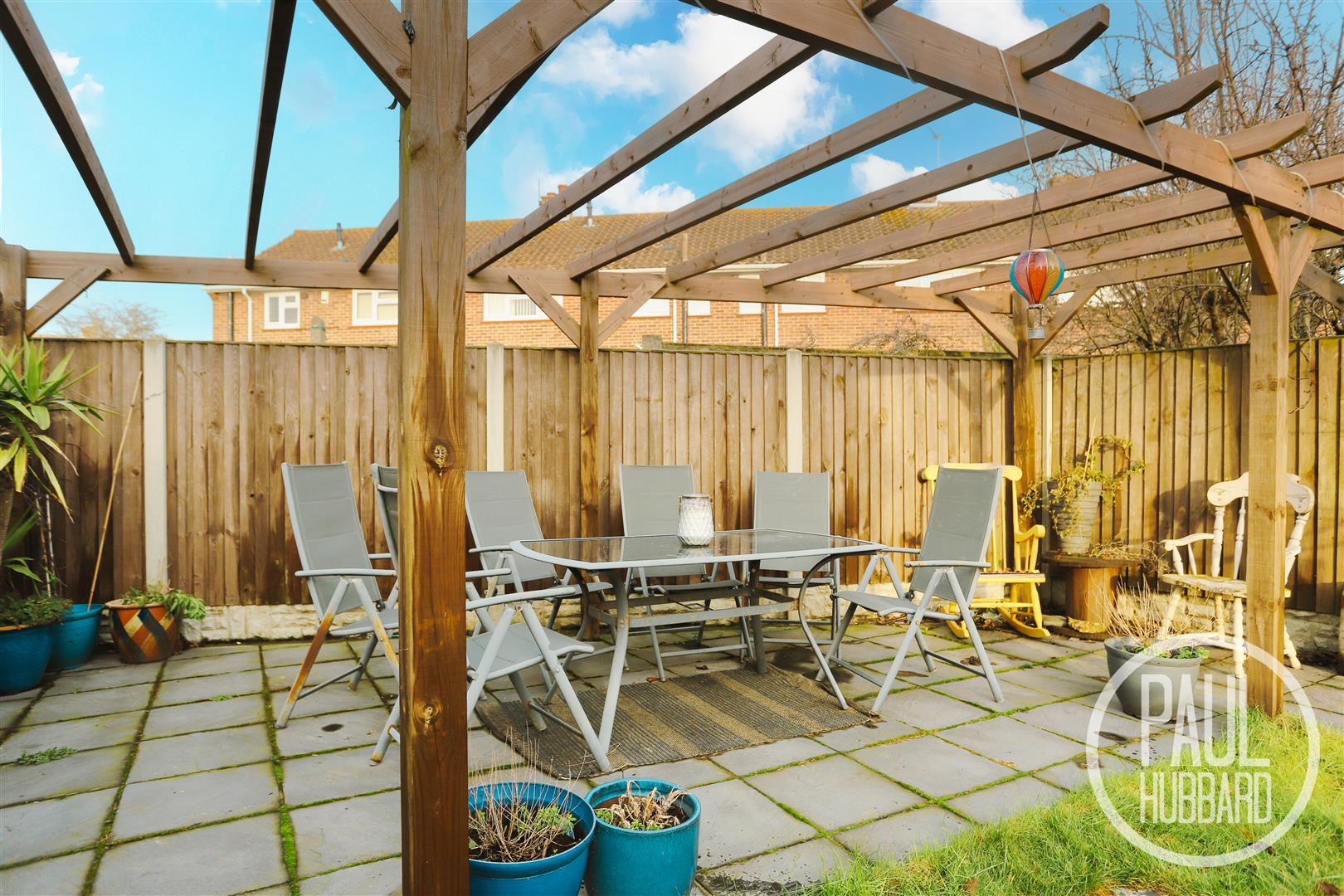 The rear garden is fully enclosed and is primarily laid to lawn. Stepping stones lead to a patio area, which features a timber-frame pergola and provides an ideal space for a table and chairs for outdoor dining. Some fixtures currently in place, including the timber storage shed, will be removed by the current owner; however, the area will be made good for the new owners.