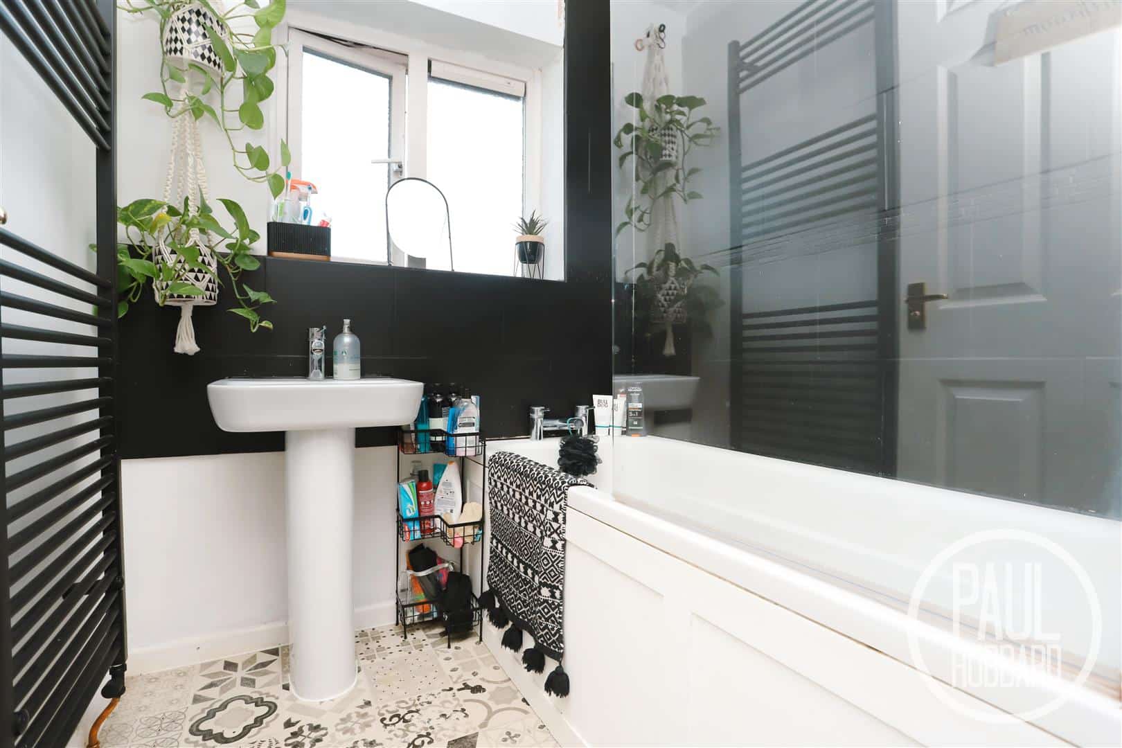 Vinyl flooring, UPVC double glazed obscure window to the rear aspect, newly fitted heated towel rail, extractor fan, part-tile walls, pedestal wash basin with mixer tap, panelled bath with a mixer tap & a mains-fed shower set above.