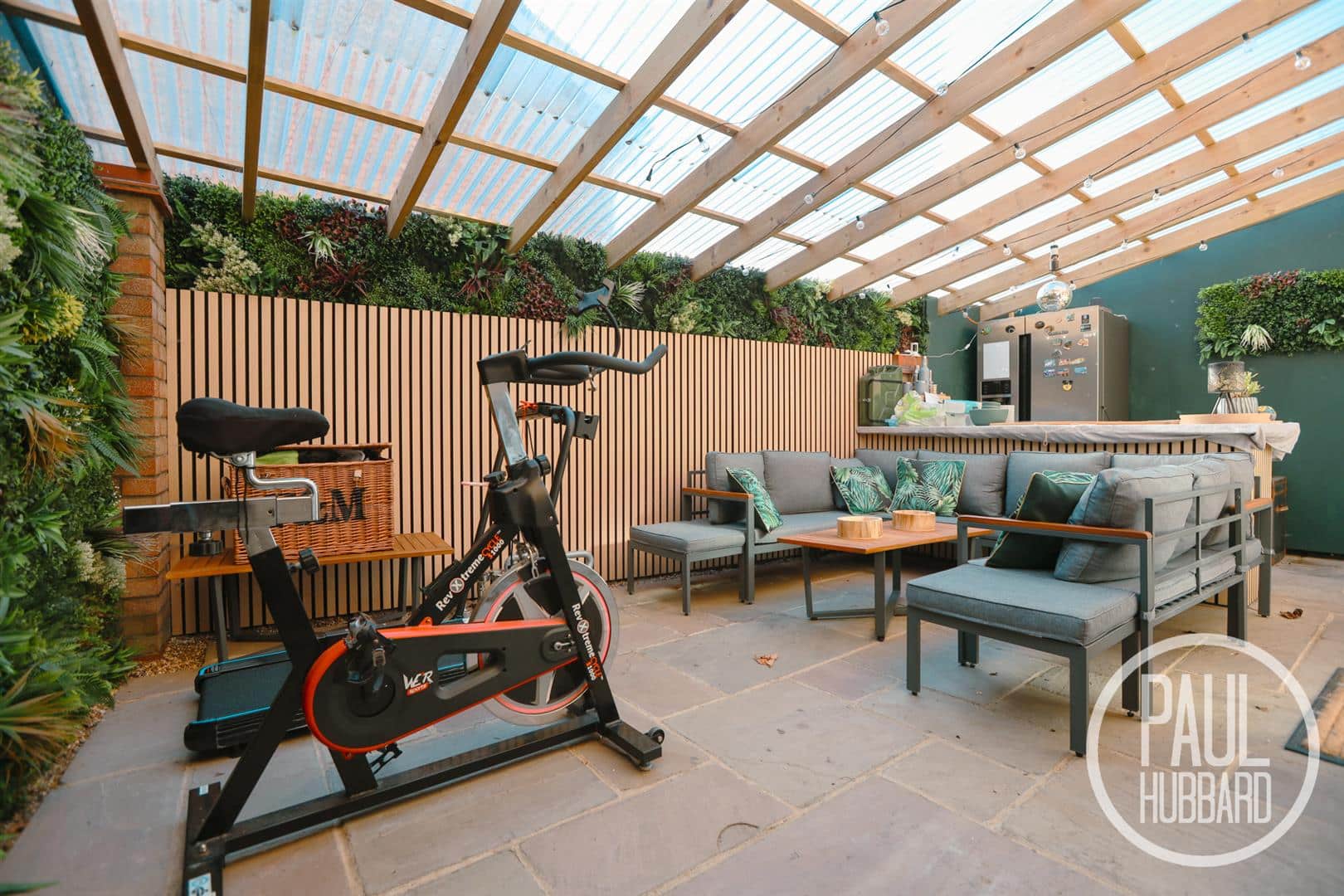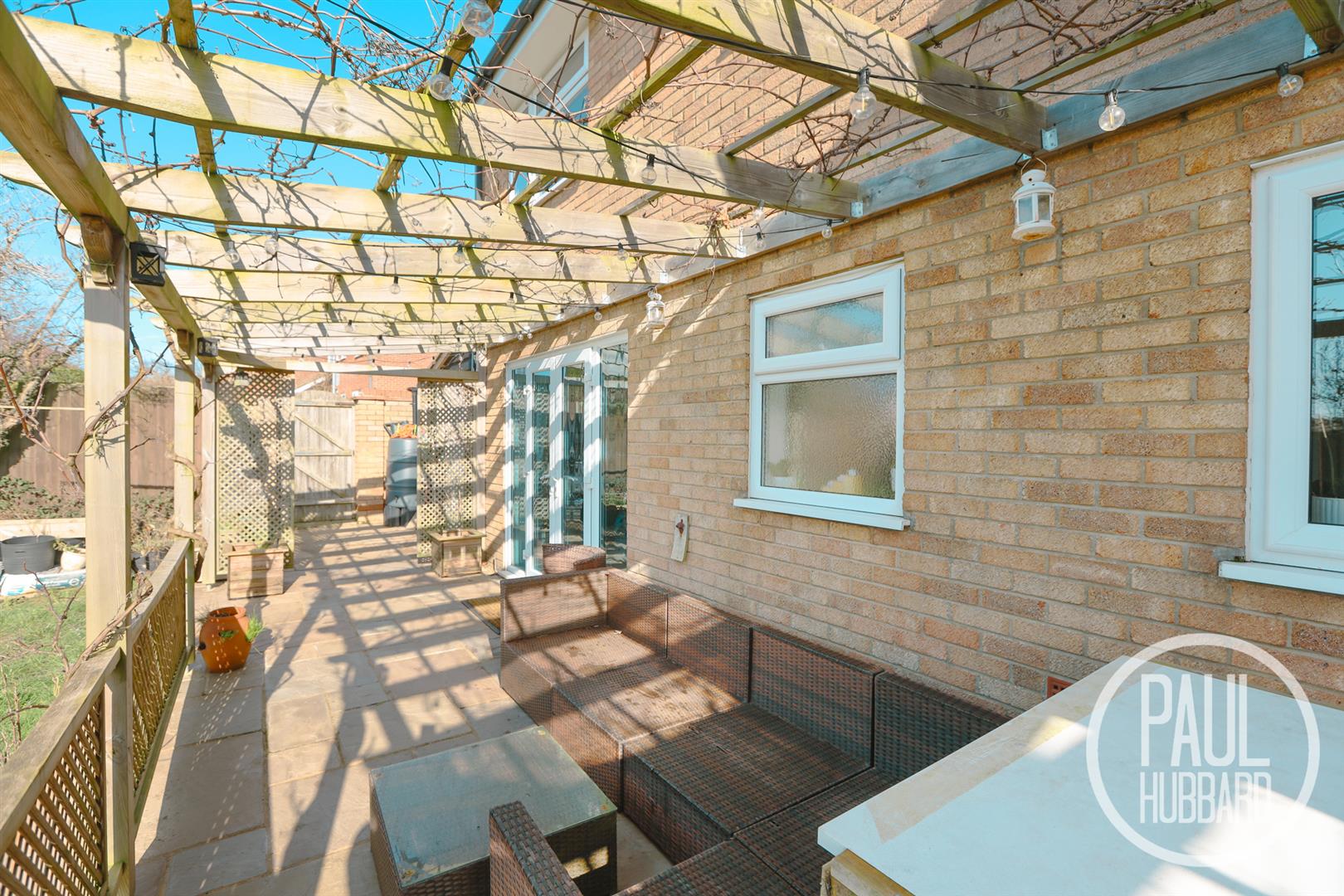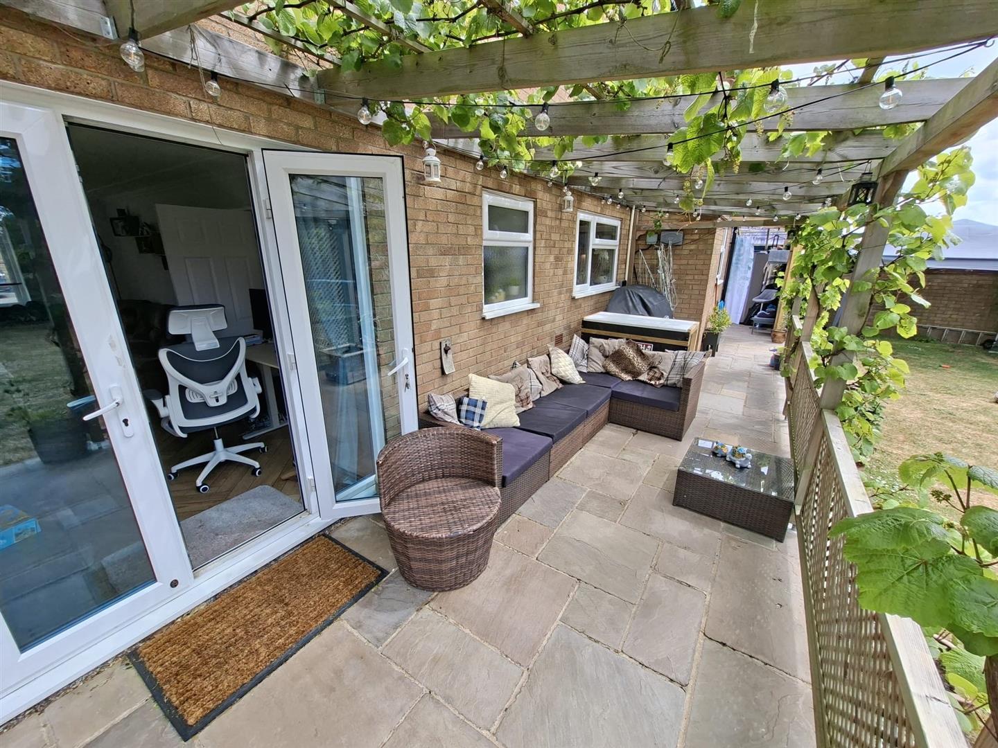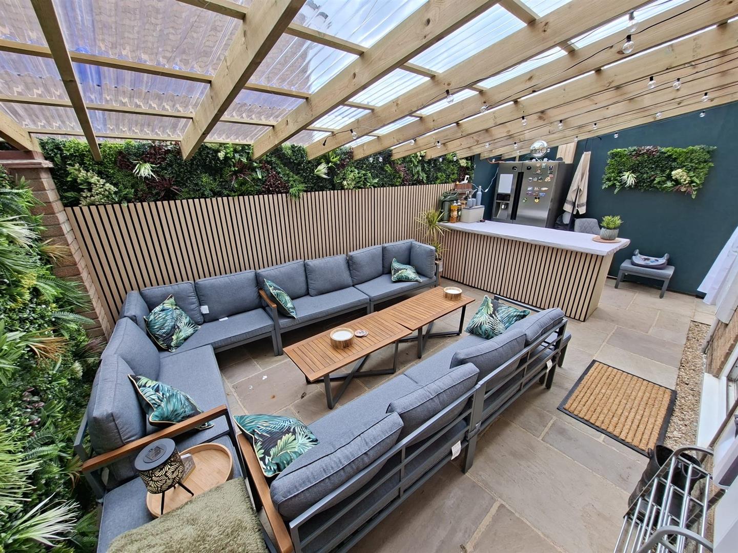 Located off of the side of the property, this intentionally built space provides a great entertaining area, with patio flooring, light and feature artificial plants and wood panelling. An opening then leads round to an additional patio seating area and the main rear garden.