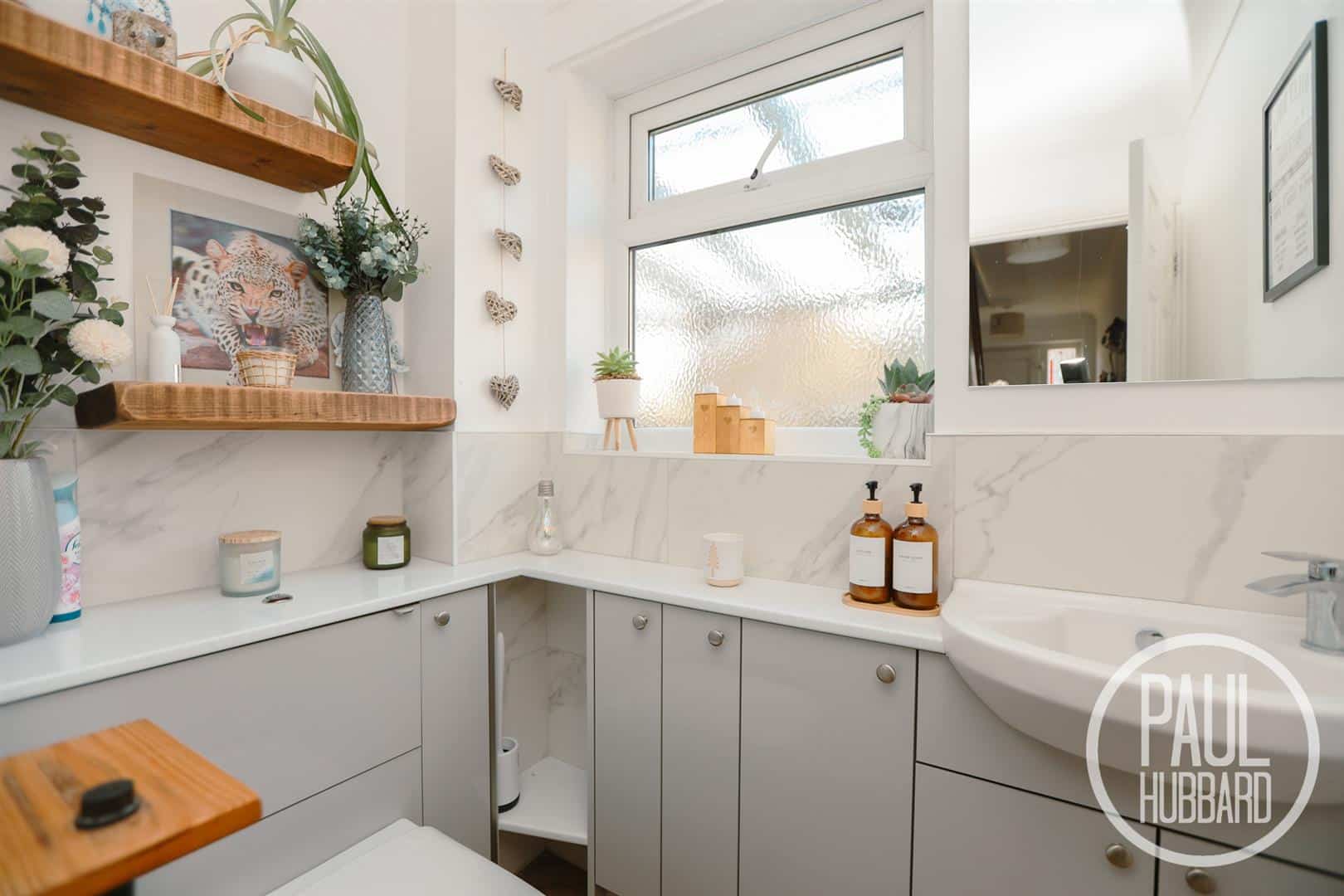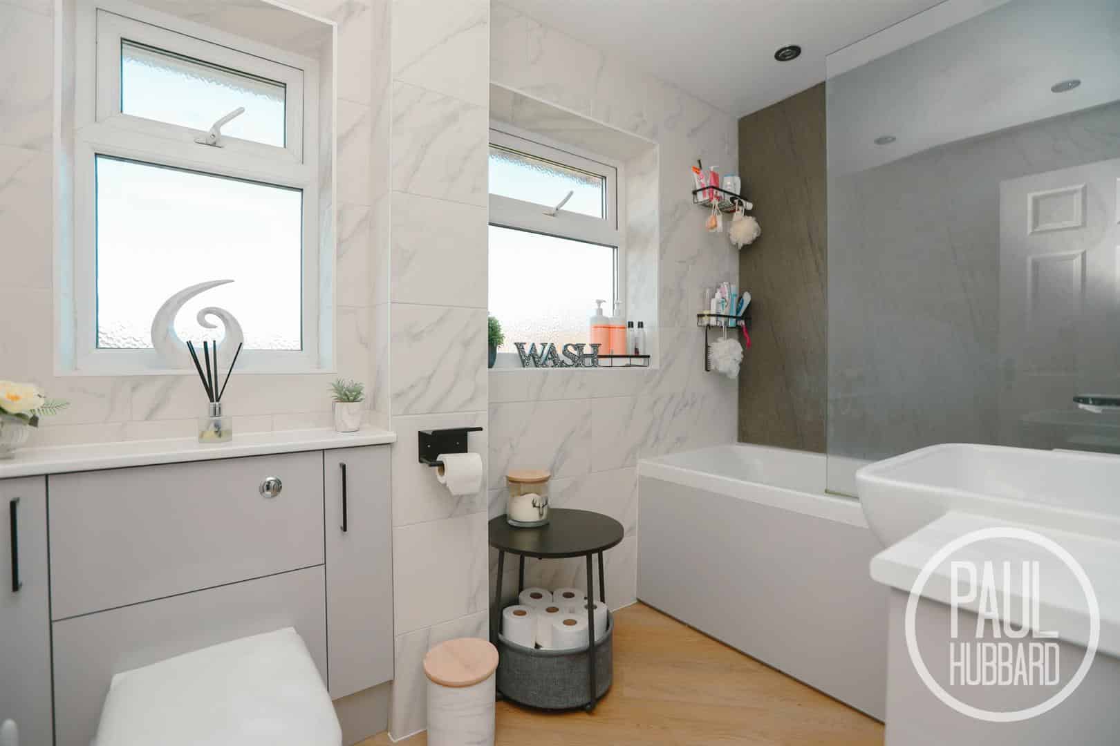 x2 UPVC double glazed windows to the rear aspect, a recently fitted suite with wood effect laminate flooring throughout, heated towel rail, tile and aqua board panel walls, bath with mains fed rainfall shower above with handheld attachment, vanity unit with inset hand wash basin, heated demist mirrors with integral lighting, a shaver point and toilet with hidden cistern.