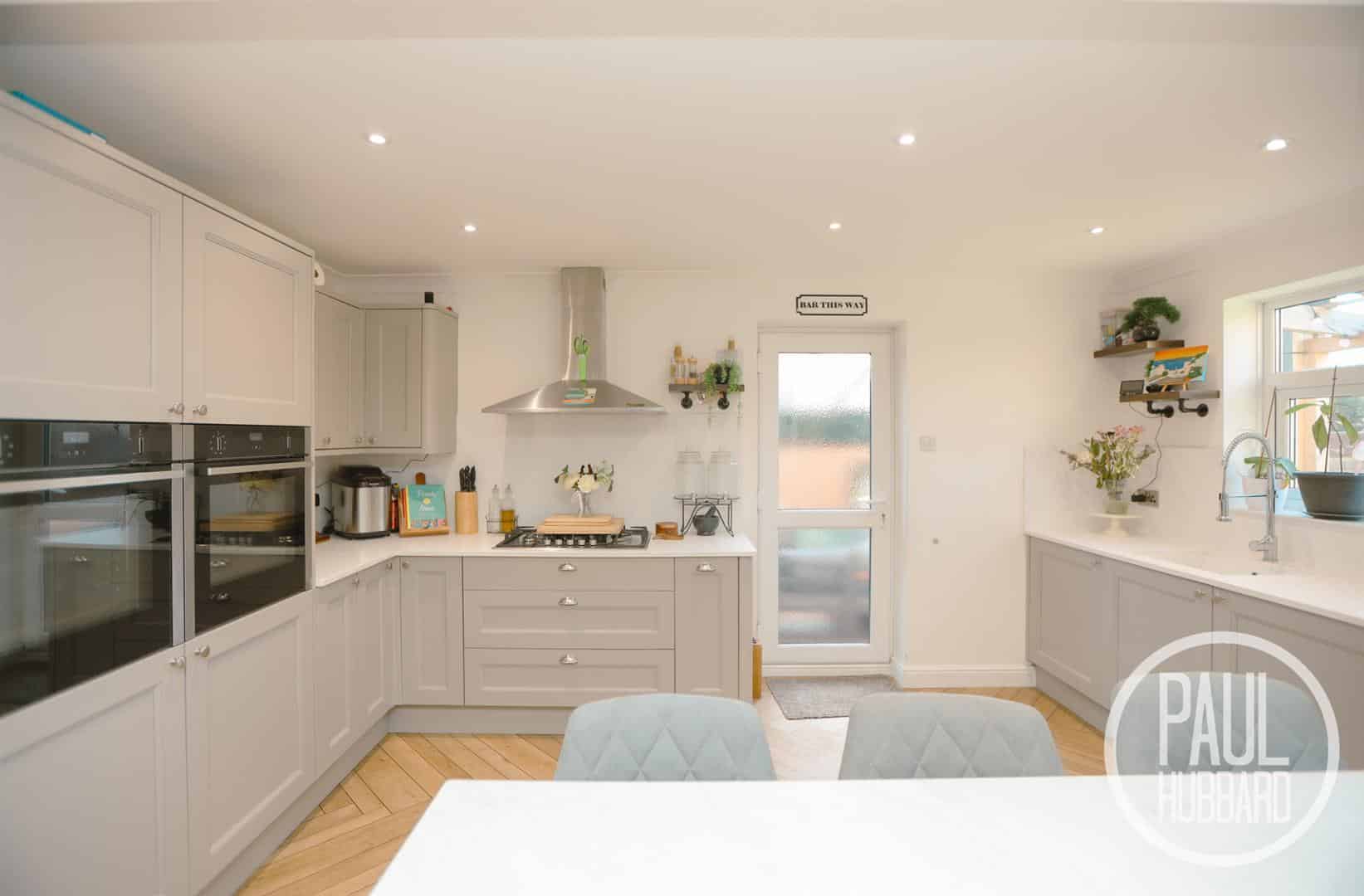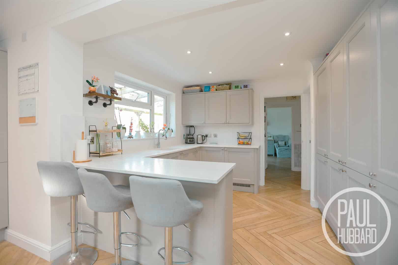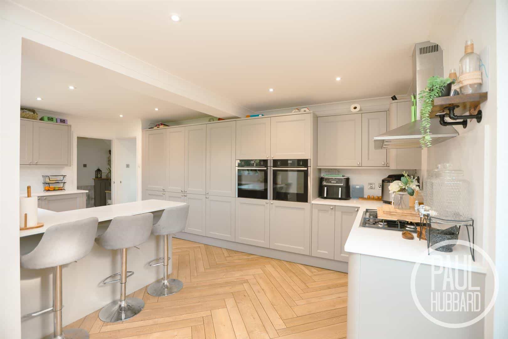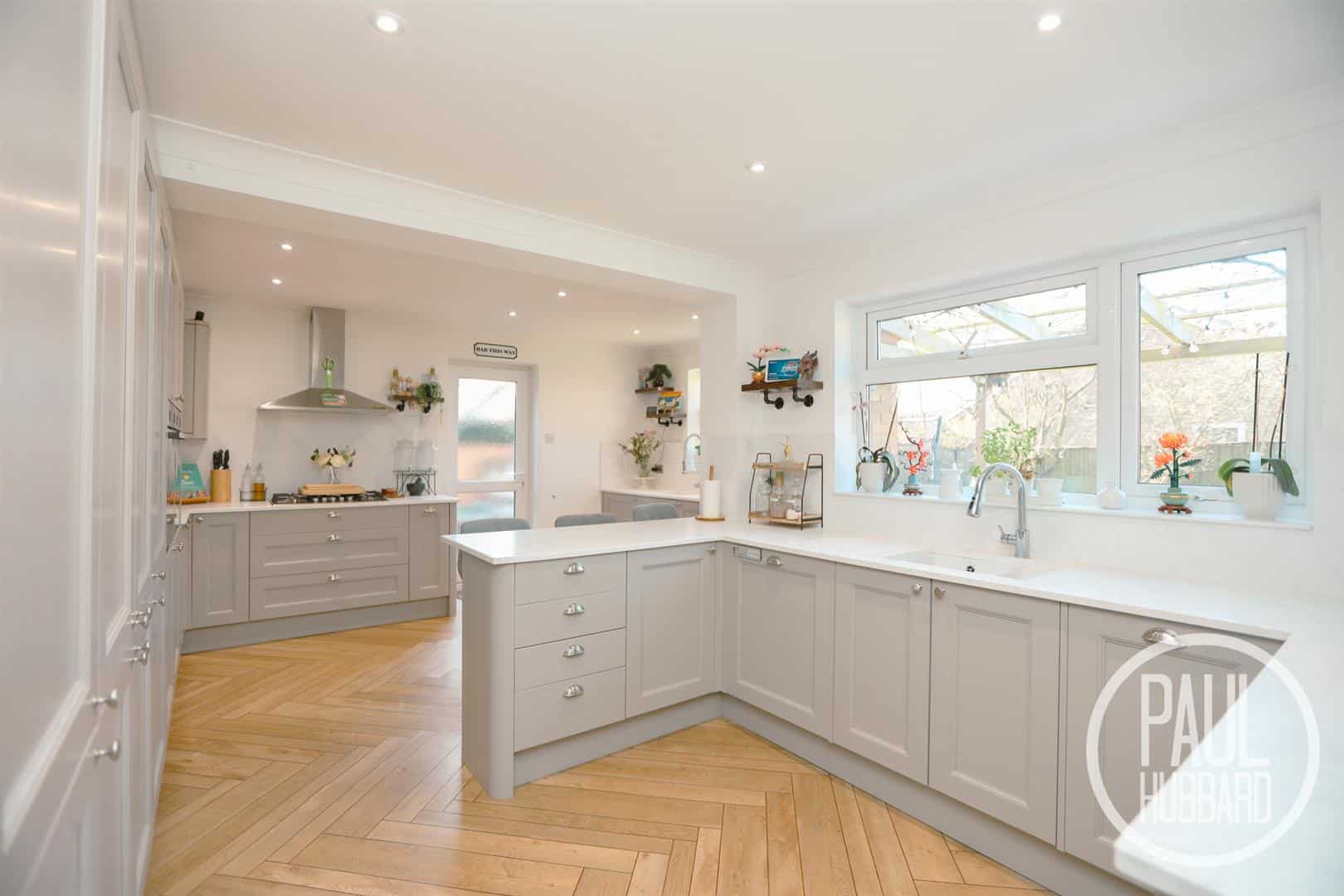 x2 UPVC double glazed windows to the rear aspect and door to the side aspect opening into the garden room. A recently fitted Howdens kitchen comprising of a selection of units above and below, Corian work surfaces, inset sink with integral draining board, breakfast bar, integrated appliances including a dishwasher, fridge freezer, additional base unit fridge, pull out bins, stainless steel extractor fan, 5 ring gas hob, x2 slide and hide ovens and LVT flooring throughout.