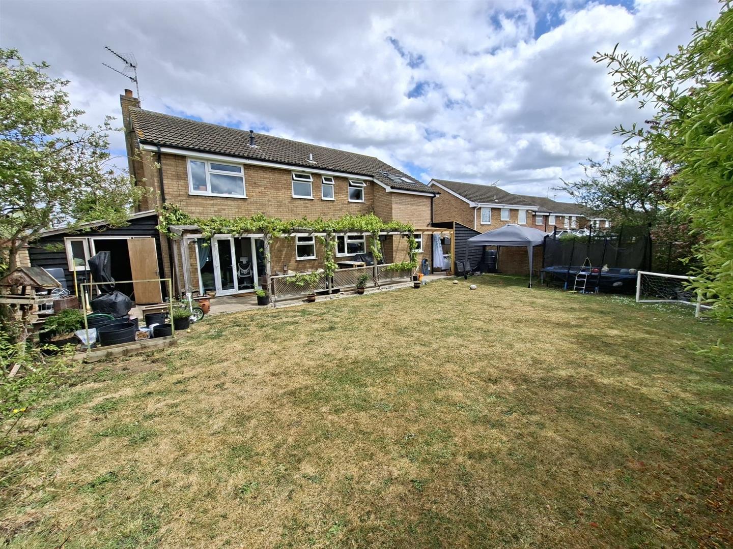 To the rear of the property a fully enclosed, south west facing laid lawn garden boarded with mature trees and has a patio seating area which stretches across the back of the property with timber pergola, outdoor sockets, wrapped with grape vines. A door provides access to an adjoining workshop which benefits from light and power and side access via a gate.