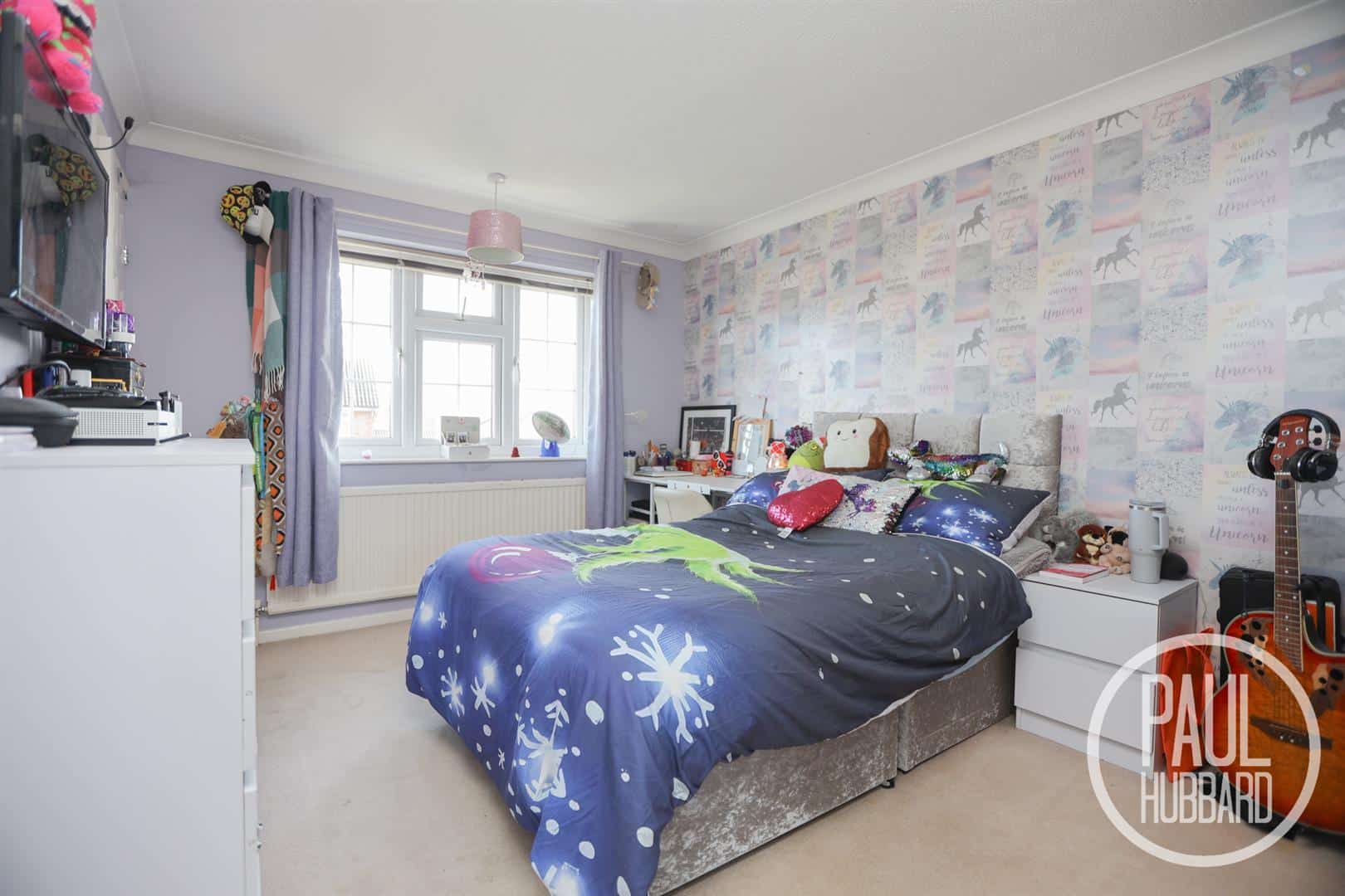 UPVC double glazed window to the front aspect, carpet flooring throughout, a radiator and doors opening to built in wardrobes and drawers.