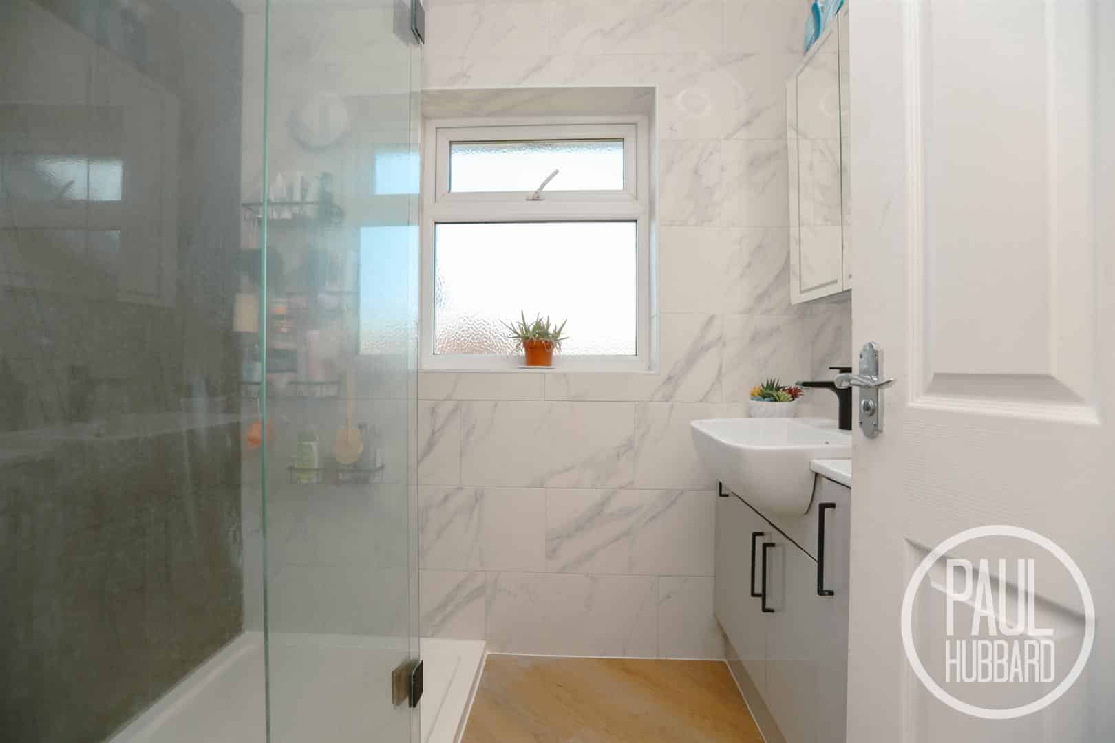 Separate to the main bathroom, with UPVC double glazed window to the rear aspect, a recently fitted suite with wood effect laminate flooring throughout, tile and aqua board panel walls, vanity unit with inset hand wash basin, heated demist mirrors with integral lighting, a shaver point, heated towel rail and sizeable walk in mains fed rainfall shower with handheld attachment.