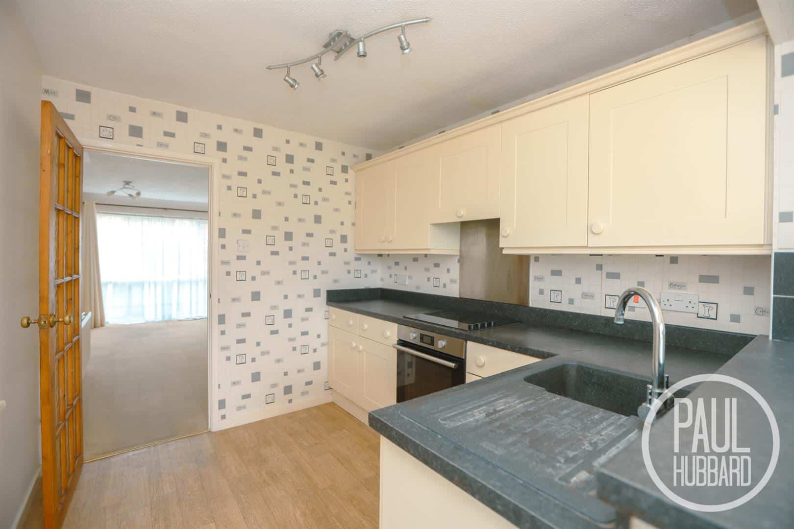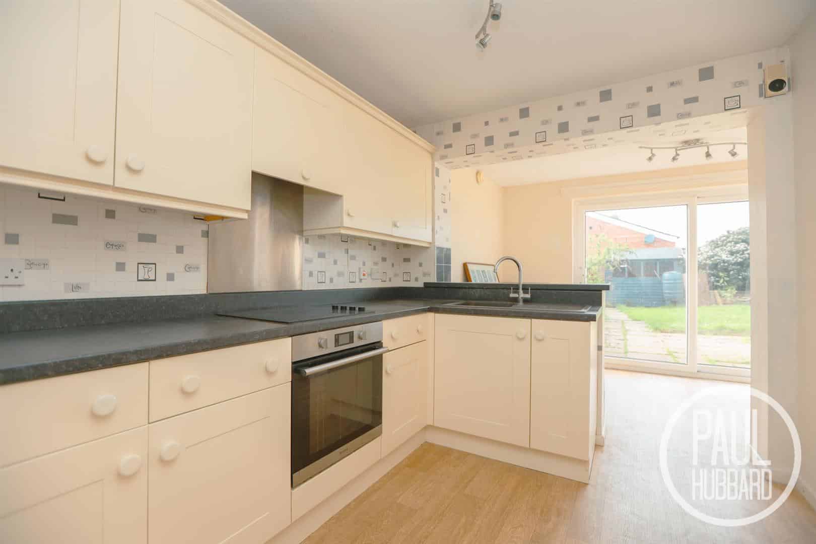 Vinyl flooring throughout, units above and below, laminate work surfaces, composite sink with drainer, 4 ring ceramic hob with extractor fan above, integrated oven, a radiator and an opening through to the dining area.