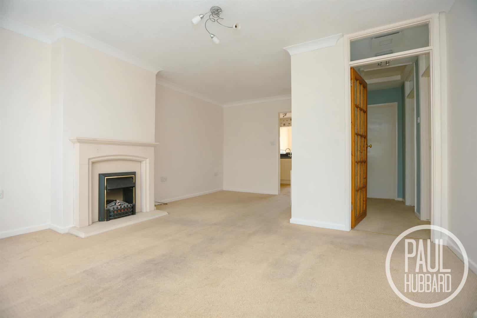 UPVC double glazed window to the front aspect boasting natural light, carpet flooring throughout, a radiator, electric fire, and doors opening to the kitchen diner and hallway.