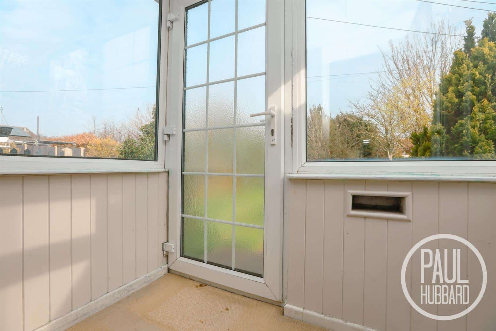 UPVC double glazed entrance door and windows surround, carpet flooring throughout and a door opening into the sitting room.