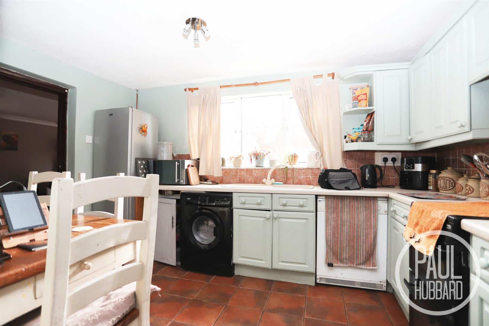 UPVC double glazed window to the side aspect, tiled flooring throughout, part tiled walls, a radiator, units above and below, composite sink with drainer, integrated extractor fan, spaces for an oven, washing machine and fridge/ freezer and a door opening to the sitting room.