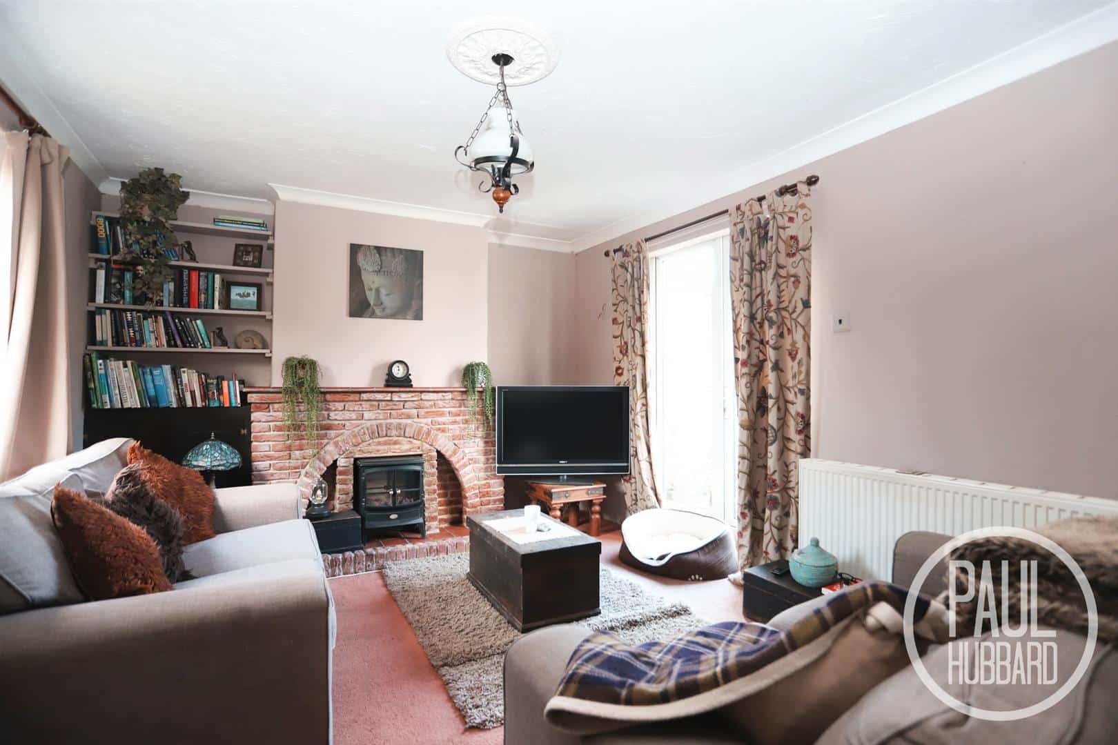 X2 UPVC double glazed windows to the rear aspect, carpet flooring throughout, a radiator, feature fireplace with brick surround, a storage cupboard, stairs leading to the first floor landing and French doors opening to the garden.